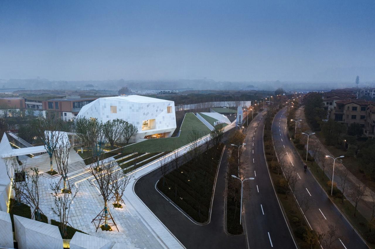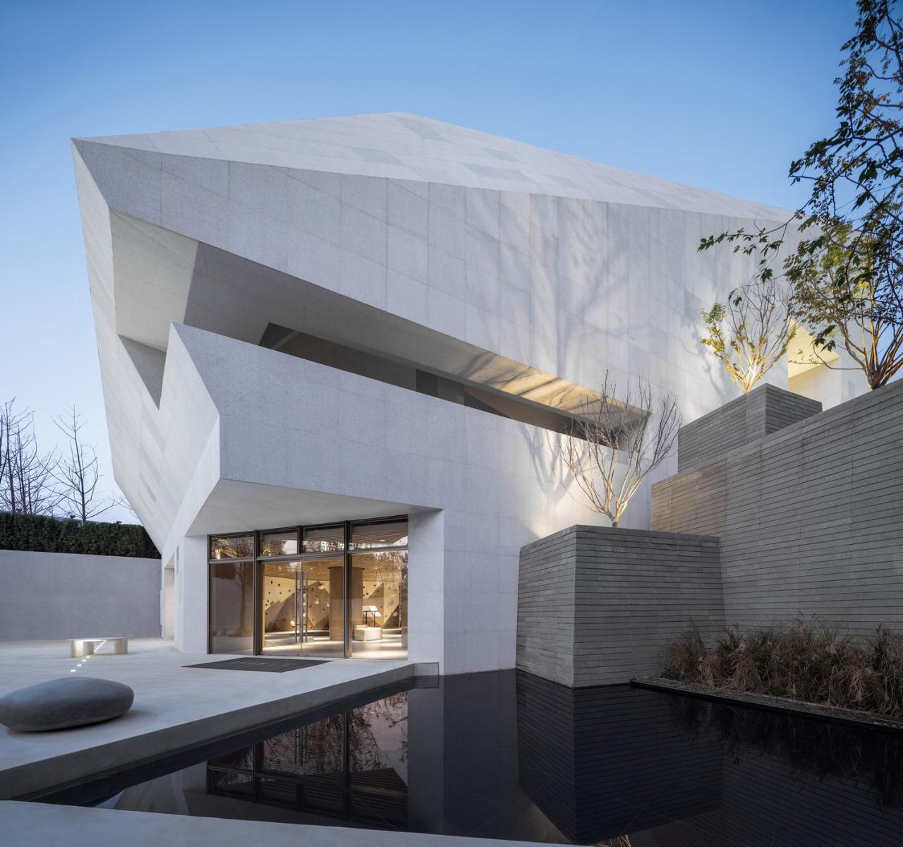 美术馆的形式是发乎于自然的。以原石造型为启发,白与灰为基本色调,形成自然、纯净、融合的视觉感受。朝向城市一侧的立面显得整洁干净,成为新地标的同时不显突兀;朝向内景的一侧则与几何形态的公园景观相融合,形成互动的空间。人与自然的交互、人与人的交流。