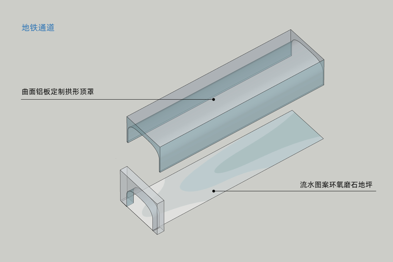 我设计了一个蓝色拱顶象征水光映射的隧道作为C区通道联系地铁。江水在这里缓速平静地流淌。我把地铁看成上海一种的特殊形式的河流,江水汇聚升格成地铁四通八达于上海。