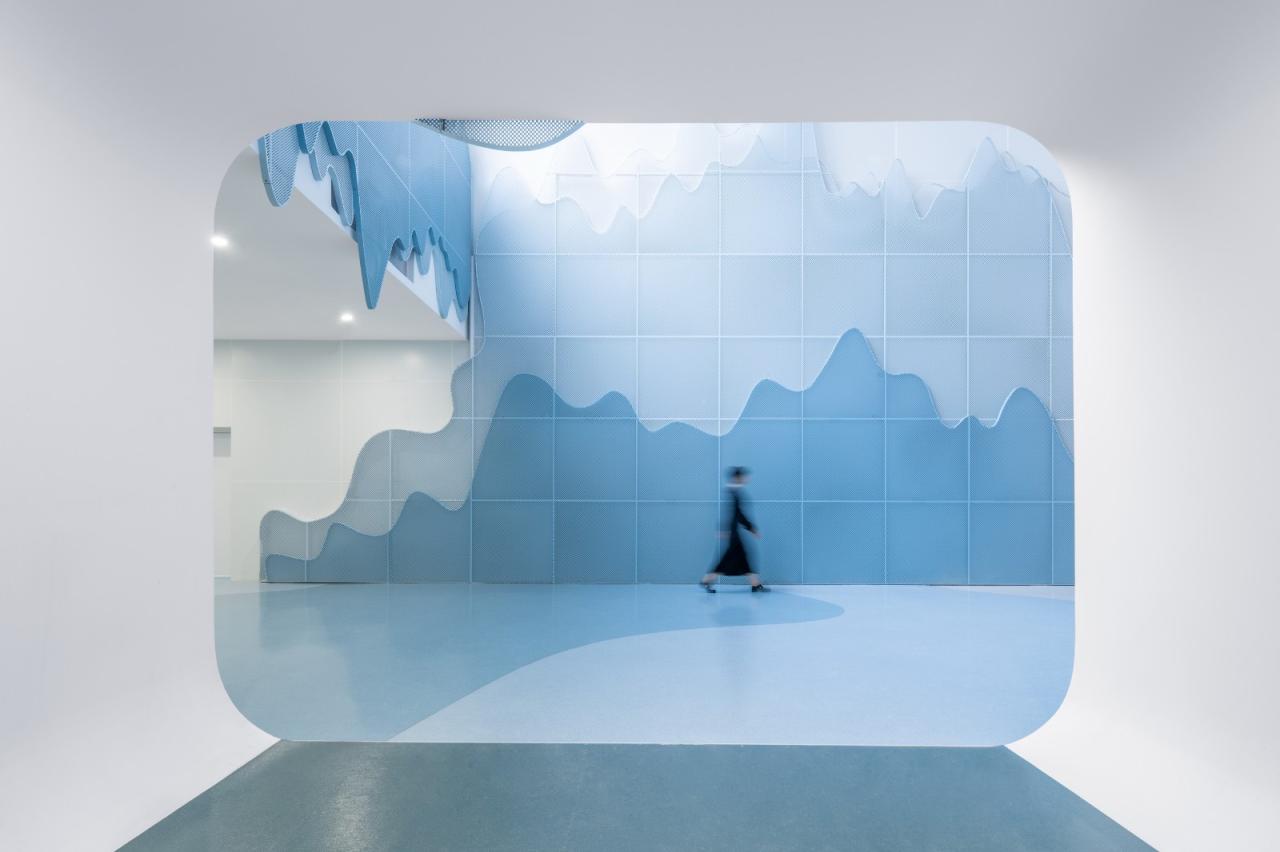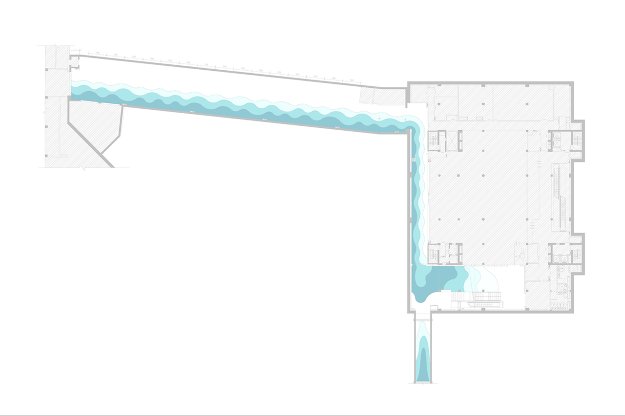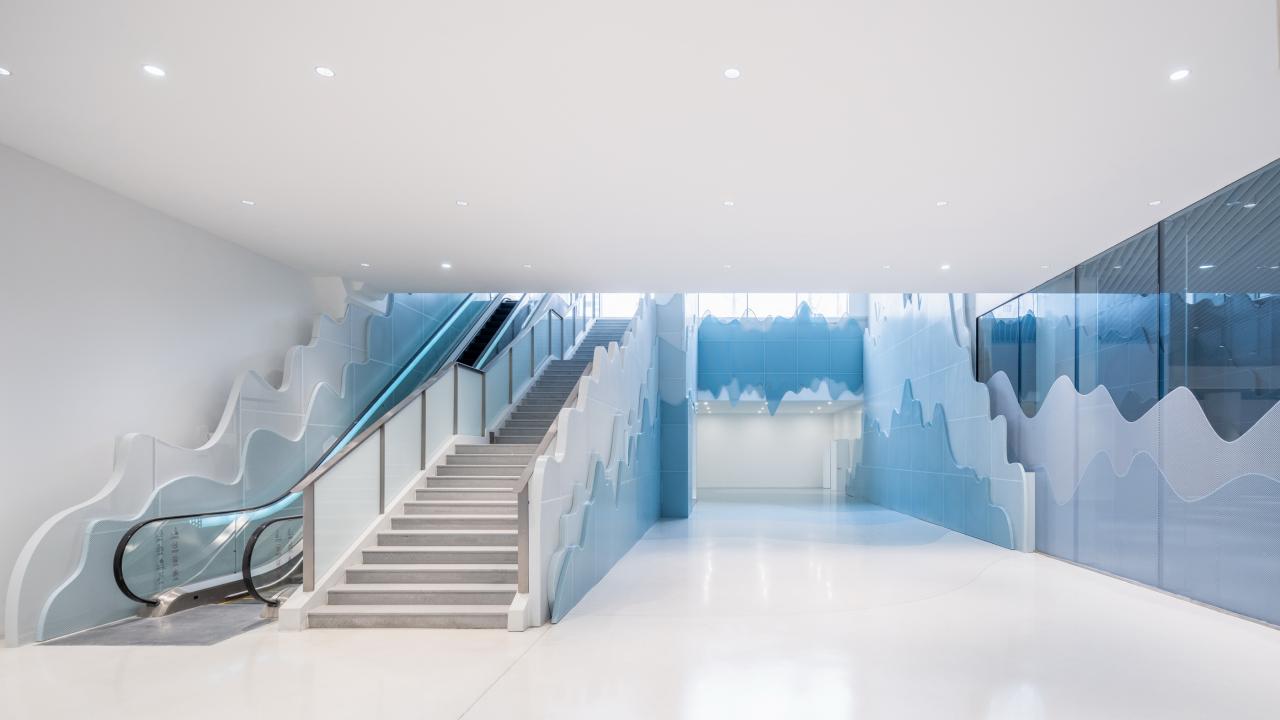而对于地下空间来说,各类安全保障以及通风采暖等设施要求再规范上是最严格配置,这就给追求纯粹的建筑师出了极大的难题。工作室天花上采用参数化设计的波浪GRG造型模块塑造出了波澜壮阔的浪潮,并为了保证这片“水面”完整无暇的效果,设计团队通过与设备厂商密切合作,在模型中精心寻找并定位“隐藏”设备的最佳位置和角度(没错,风口要根据浪花调整角度并保证风量),最终在确保所有设备不折不扣保证规范要求效果并得以落位的同时,把设备对视觉整体感的干扰也降低到了最低程度,实现了令人震撼的整体效果,澄澈的浪花在头顶和壁面翻滚。市民门站在岸边,看着蜿蜒流淌的河流,一定会有冲动想乘风破浪,转千弯,转千滩去上海。