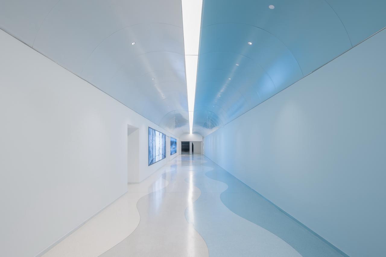 江水进入“闸”门后减速。加上B区本来就是展览区,需要放缓节奏。所以吊顶变成简单拱顶,延续A区一半蓝一半白的分区。白色墙壁上只安装两个大型屏幕,播放上海代表性的新落成的文化生活空间。这个区域很平静,不过对于建筑师而言,确实要克服许多难点才能用一个完整统一纯粹的叙事加以表达。要在高低不一的零散组织的场所里实现具有高度一致性和沉浸感的空间体验,就必须在尽力塑造整体感的同时降低干扰。