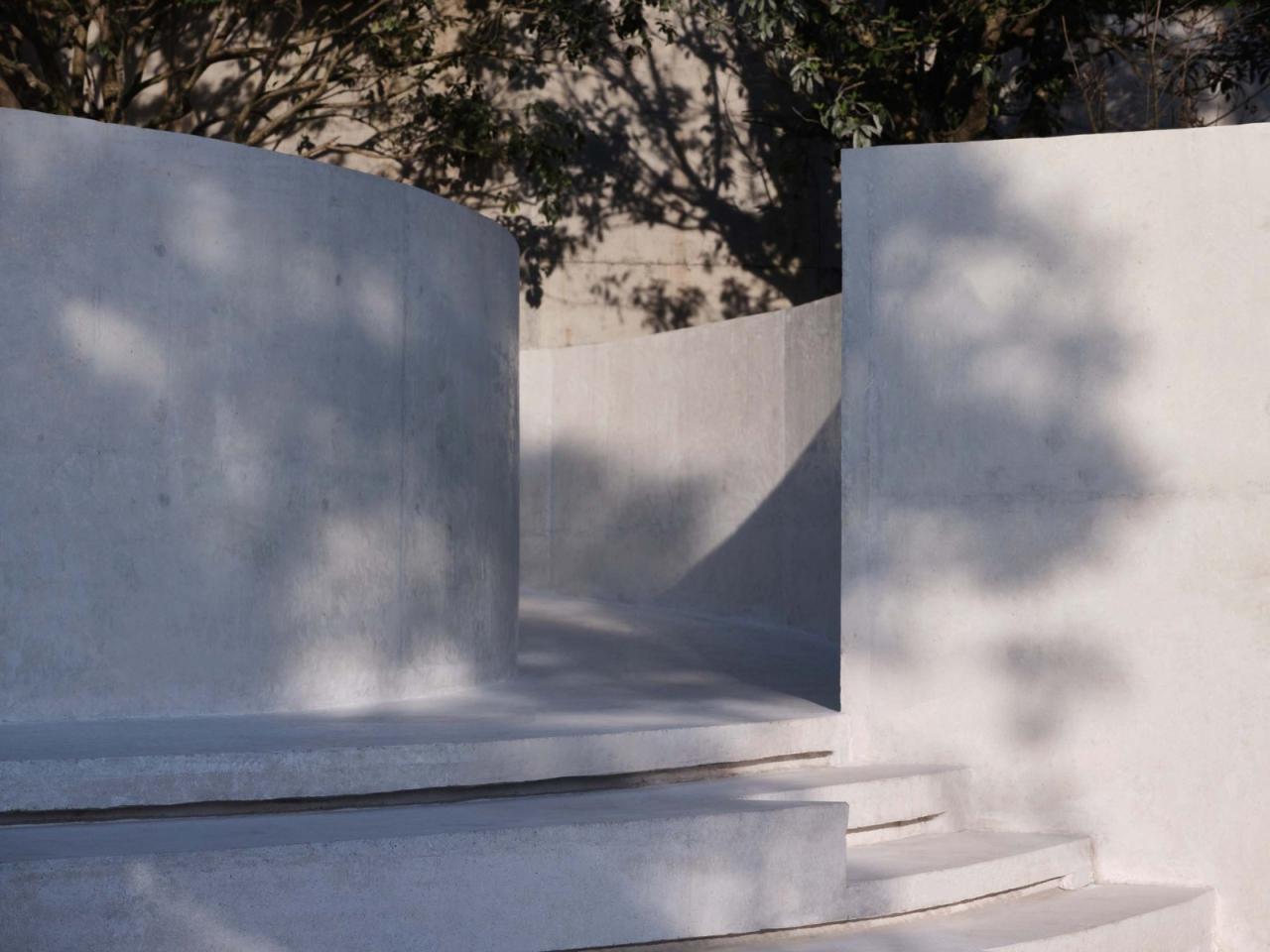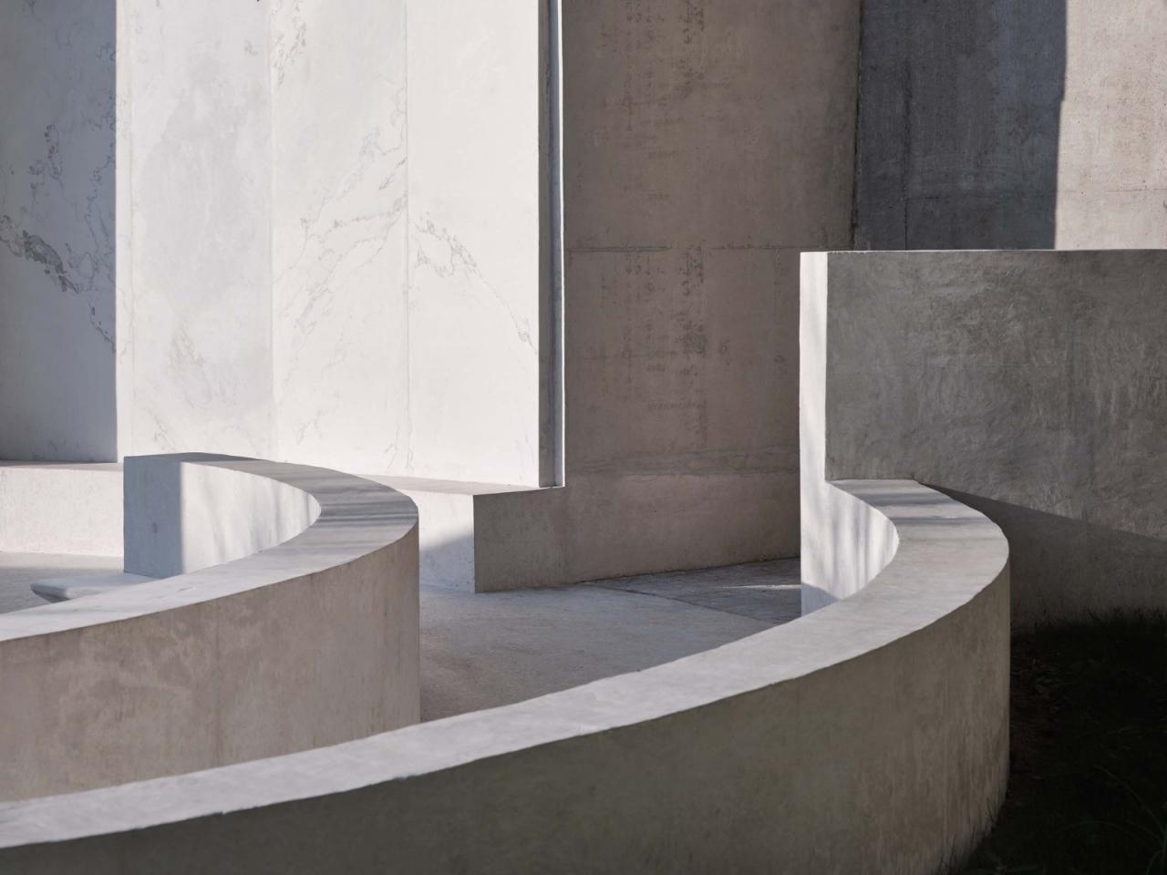 纪念碑成为一个微型的日常场所系统,全部由白色混凝土浇注而成,如同磬石,与山脚自然的林木、地势嵌为一体。建筑的材料是纯一的、厚重的,衔接呼应,如同生长出大地。
