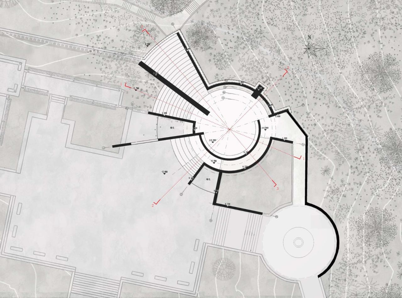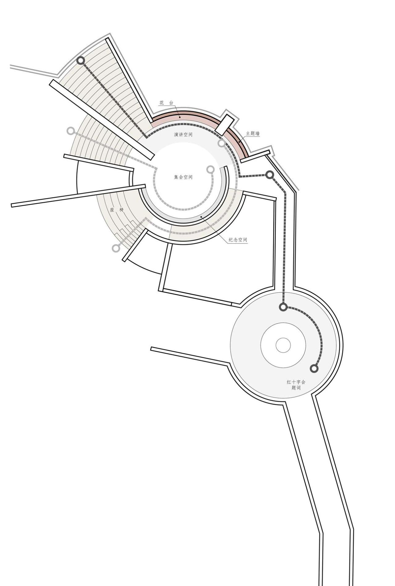 沿放射线形成不同的台地与阶梯,提供端坐静思之地,沿台级而上的路线形成折转忽见的参观之径,纪念碑、纪念墙与坐凳围合成核心的圆形场地,提供可供五六十人使用的小型纪念活动场所。