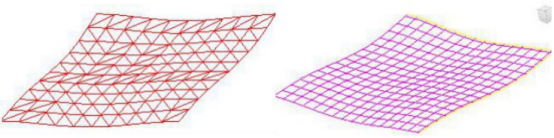 Civil3D在创建三维地形曲面时,提供了三角网曲面和栅格曲面这两种构建地形曲面的方式,如图2所示。三角网曲面是通过对空间离散点进行Delaunay(德洛内)三角剖分而形成,Civil3D自动分析彼此空间距离最近的曲面点来创建组成三角形的三角网线,曲面中任何点的高程都是通过对该点所在三角形的顶点的高程进行内插来定义的;栅格曲面则是将空间离散点按规则的栅格排列而组成,根据需要的曲面精度可以手动编辑栅格的间距和方向。