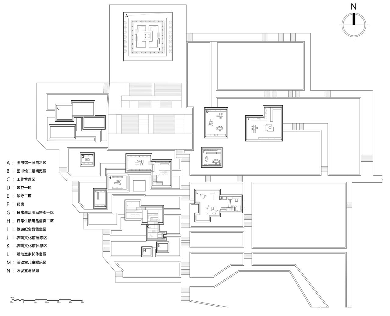 本文化综合体承担了当地居民的文化生活与外来游客的旅游配套设施的两项功能,其中包括图书馆、农耕文化馆、居民活动中心、卫生所、商业街、邮局、后勤部门等公共空间。设计方案尊重当地川盐古道传统建筑空间格局,建筑皆为一至两层。