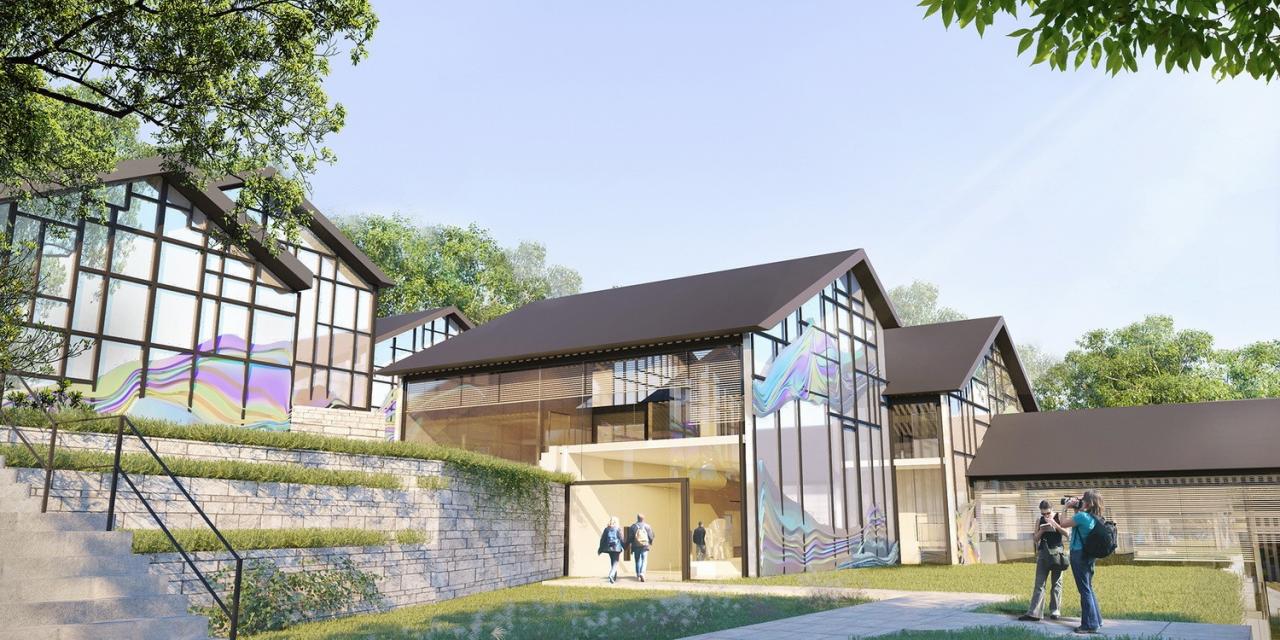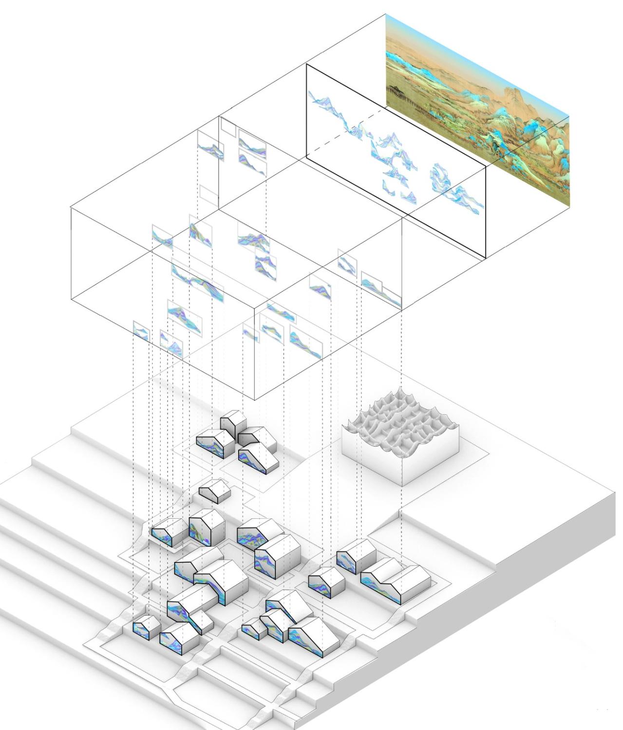 受当地群山环绕的意向启发,在建筑外立面上通过彩虹山形玻璃来再现其山之连绵。由南而北望向整个建筑群,不同建筑立面上山形玻璃会相连在一起,与后山形成呼应,营造群山连绵的视错觉。