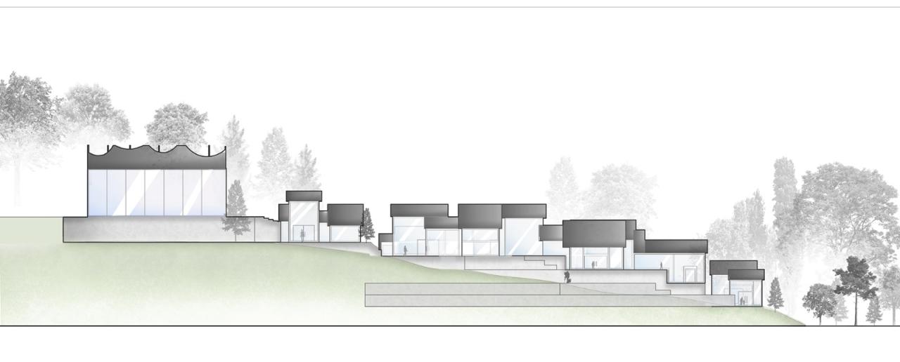 每个建筑单体的东西向,是环抱空间的透明玻璃幕墙,内部空间被吸入玻璃里,消失于自然之中。在消失的同时,也变成了建筑。自然、建筑与人和谐统一。