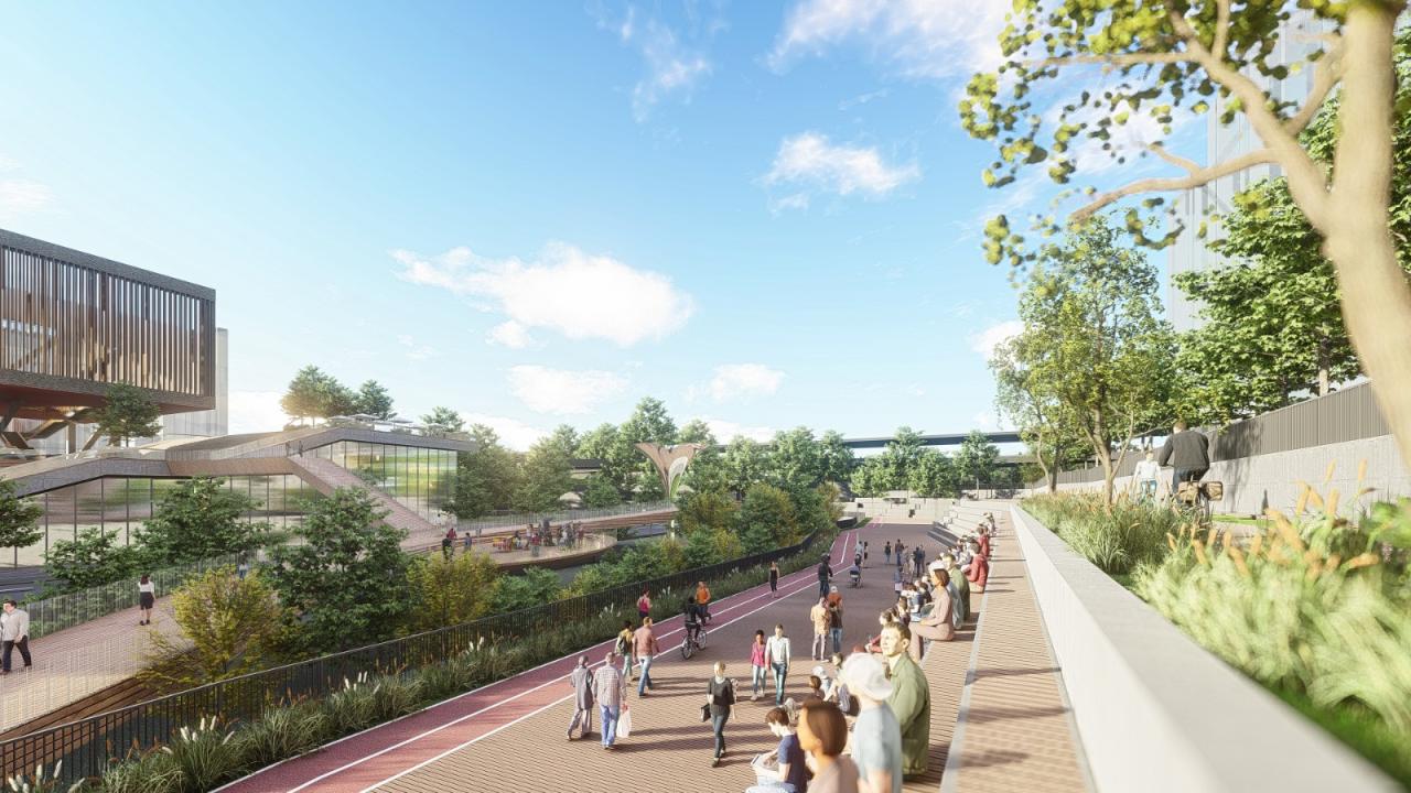 尊重原有自然风貌让建筑与人、自然三者和谐统一,无缝衔接城市空间。健康完善的公共设施、开放的街区以多个特色功能作为“兴趣点”带动区域发展,打造生态化、人性化、全天候的理想未来社区场所。