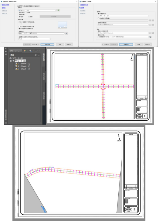 点击创建图纸命令,设置创建图纸的图幅范围为全部,勾选创建当前图幅中的所有布局,并设置图纸集储存位置,完成道路平面设计图的分幅创建,如图3所示。