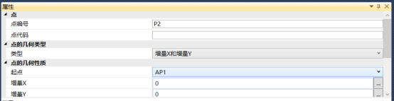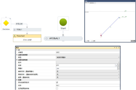判定平台放坡与原始地形曲面之间的位置关系。添加新的流程图,在新流程图中添加辅助点ap2,设置其类型为坡度和增量x,坡度为变量坡度psv,增量x为平台宽度pw,如图10所示。