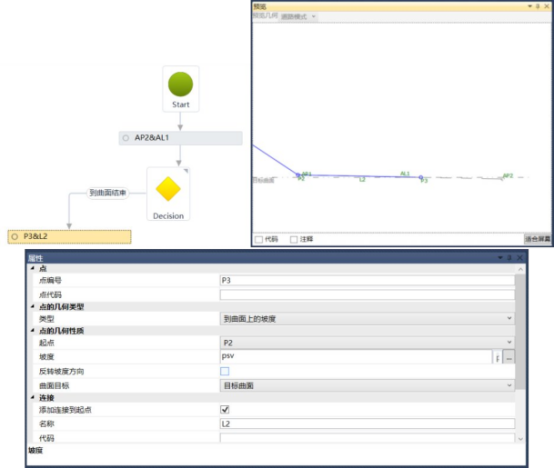 添加平台与曲面相交放坡结束情况下的放坡命令。在判定条件为真时一侧添加新建点p3,设置其类型为到曲面上的坡度,起点为p2,坡度为变量psv,添加连接到起点的连接,如图12所示。