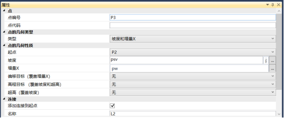 添加平台全宽继续放坡情况下的放坡命令。添加p3点,设置其类型为坡度和增量x,起点为p2,坡度为变量psv,增量x为pw,添加连接到起点的连接,如图13所示。