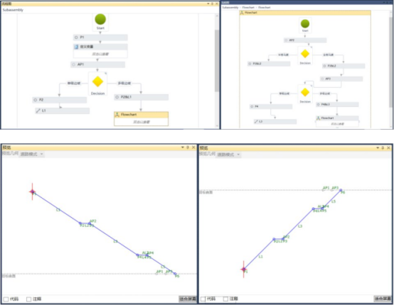 设置单级边坡情况。在流程图判定条件为单级边坡一端添加p2点,并设置p2点与辅助点ap1点位置重合。其后添加以p1为起点p2为终点的连接,完成单级边坡情况的创建。拖动曲面对象高差在3m以内,可以查看放坡预览,如图4所示。