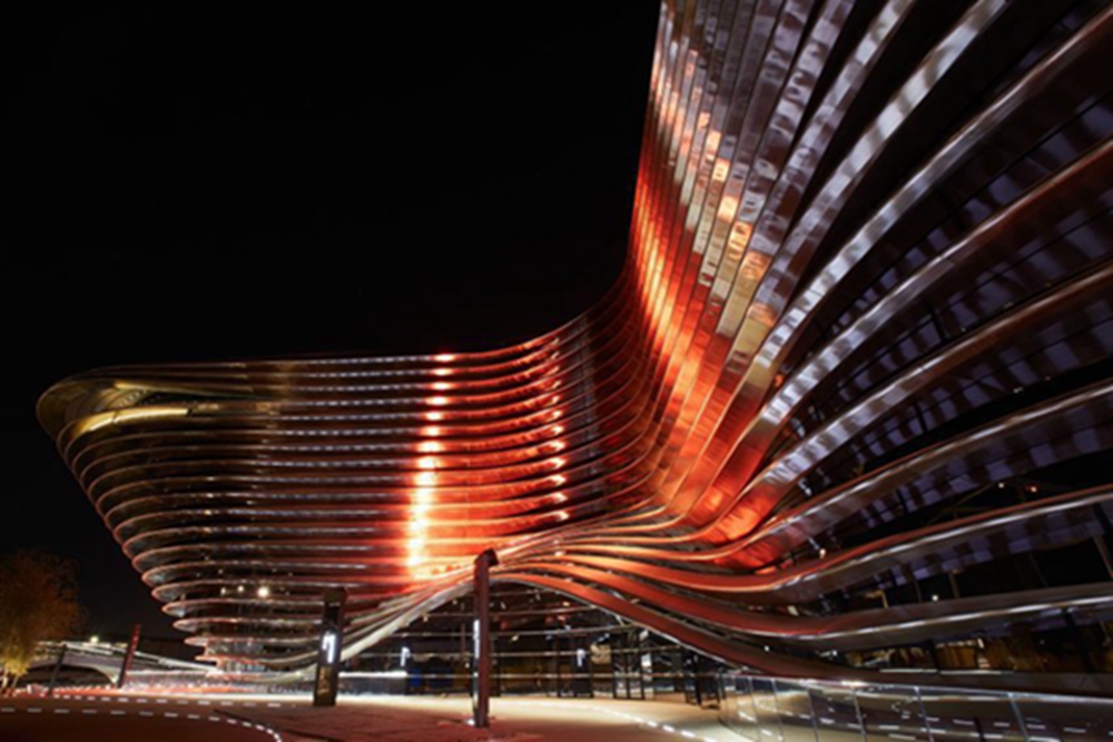 width=600他说:“我们希望反映和捕捉建筑周围的运动,这样弯曲的鳍状物可以反射周围的运动和光线,还可以让展馆从白天转换到夜晚,吸收世博会的颜色和光线。”他说:“不锈钢的使用参考了飞机机翼、火箭和赛车,”