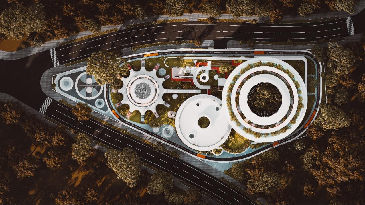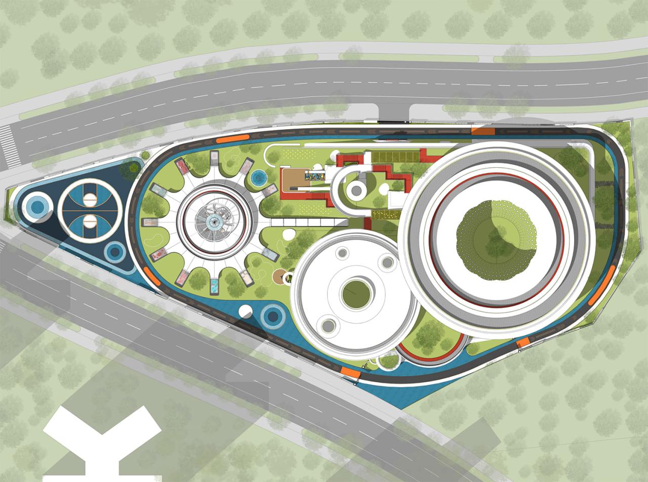 设计以宇宙星体为原型 结合「花儿朵朵向太阳」的理念 将一个个功能体块分置为散落的花朵和星球的意向 以艺术化的比例关系布置在场地内