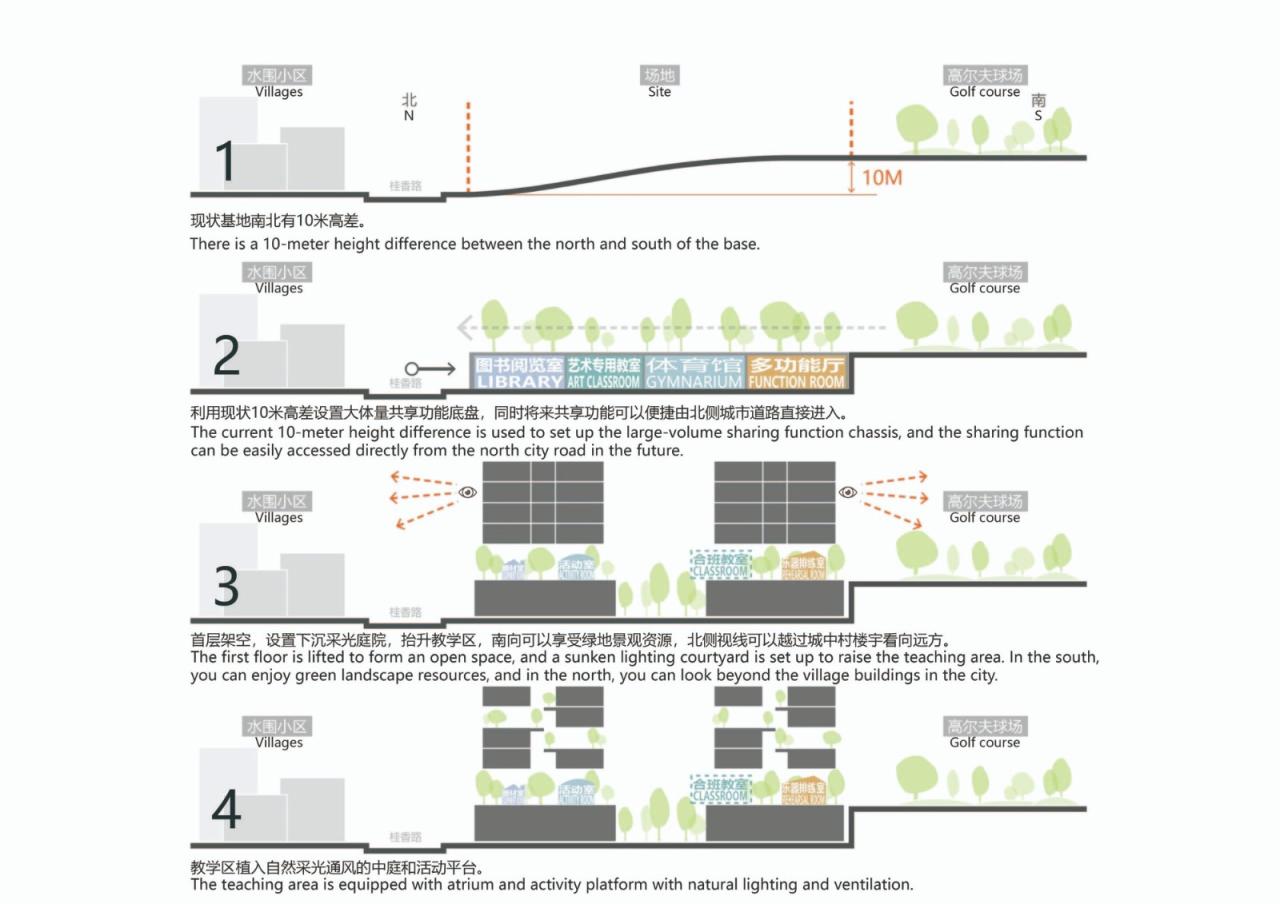 高密度校园的实现利用基地南北10米高差,进行全地形开挖,设置半地下的大体量共享功能底盘,校园主入口从临街的负二层标高进入。临街出挑的半地下室顶面有效隔绝道路噪音对上部教学楼的直接干扰,校园临街界面开放,视觉空间层次丰富,具有舒适的全天候家长等候缓冲区。学校功能空间的竖向立体分区给校园的社区开放带来管理的便利,同时又为师生提供了全天候教育综合体的空间模型。高位正负零层的设置,增加了教学楼总体楼层数的同时使南北两侧教室又都具备优良的开敞视野,南向看高尔夫景观场地,北侧恰好越过城中村屋顶看向远方,由于架空的主教学楼高度上超越了周边高密度城中村的屋顶,也保证了主教学楼优良的自然通风效果。