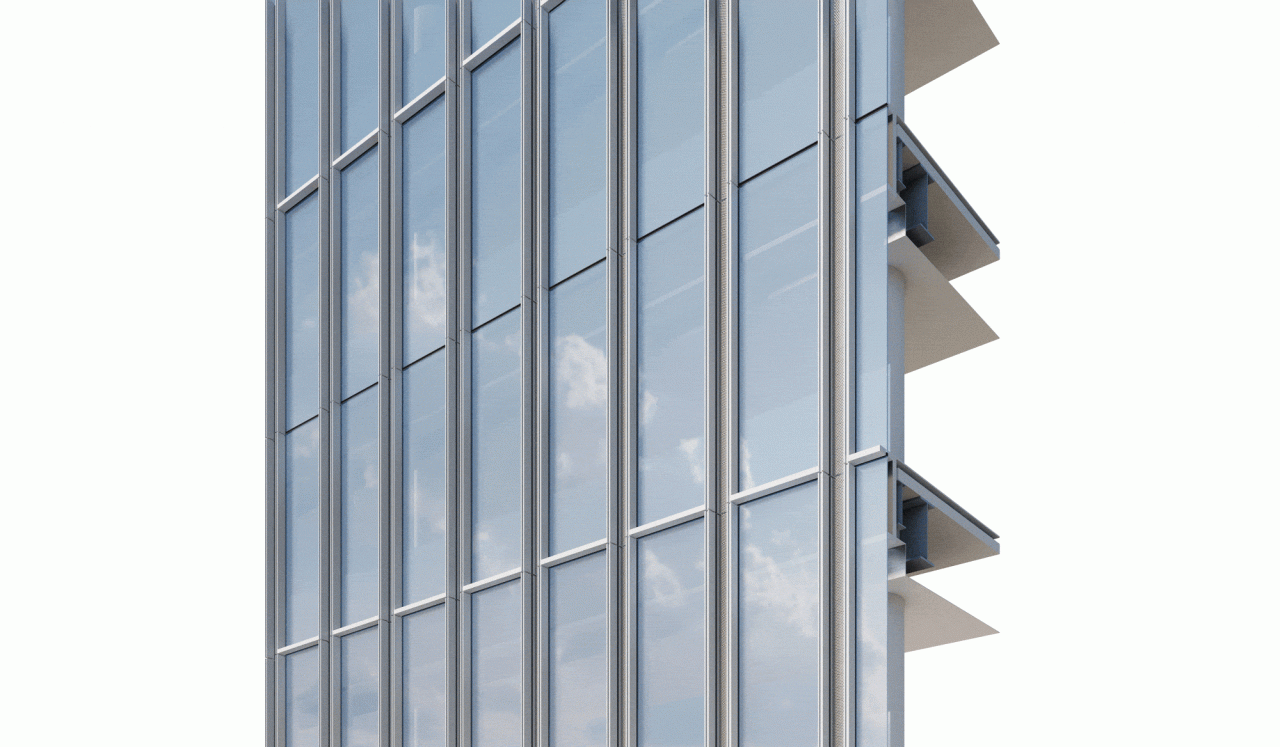 沿青年路一侧塔楼的幕墙在两根竖向杆件之间形成内倒式开启扇,使得塔楼表皮简洁整体且有细节。