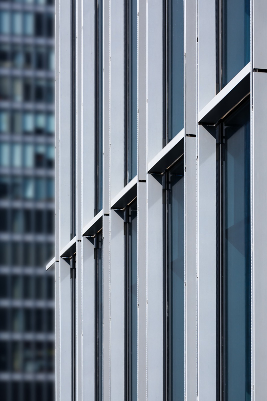 在体量上的水平,垂直表皮分解,是更好的呼应融入城市肌理的企图。通高的垂直窗以及竖向遮阳金属杆件为办公空间提供了优质的工作微环境。位于街角的多层商业表皮重复了高层体量表皮处理的建筑语汇,统一、内敛,办公楼入口大堂处的低矮出挑两蓬与水平延展的城市街道广场,增强了水平向度的扩展、包容、宜人、安全。