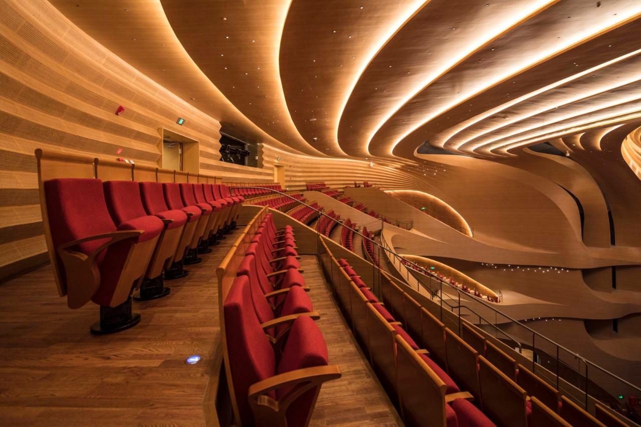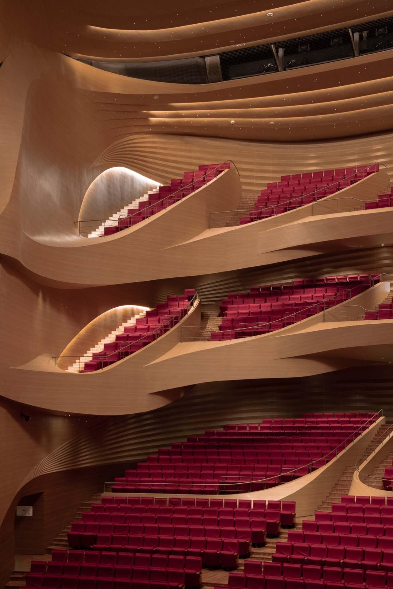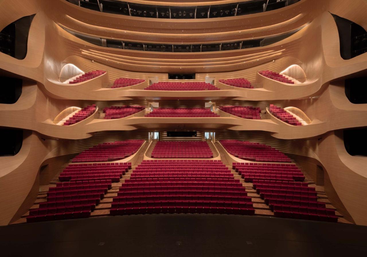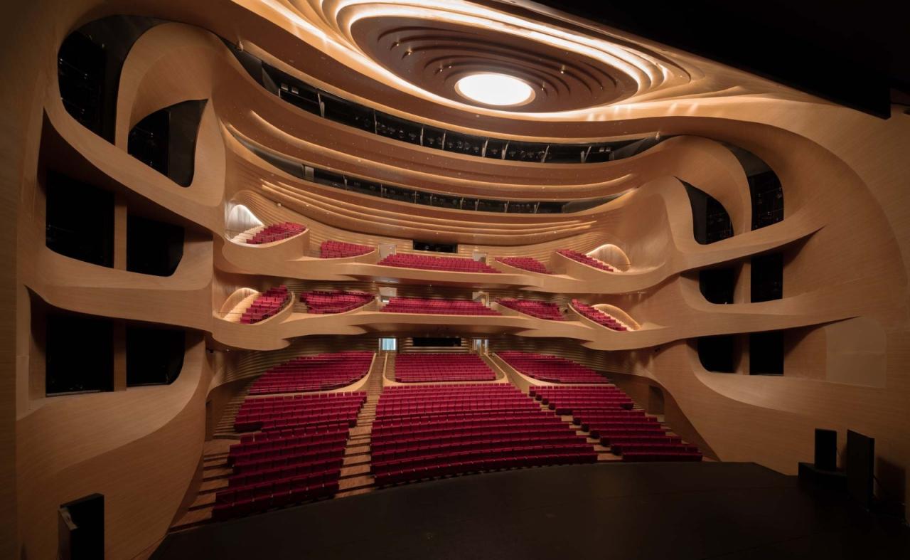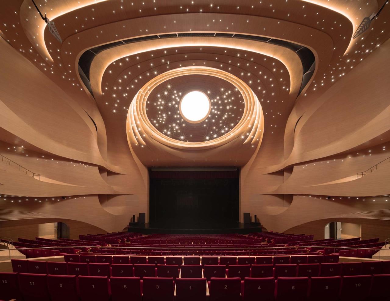1600座歌剧厅:观众厅设计以“春江花月夜”为主题,平面呈马蹄形,采用三层台地式布局的看台如繁花绽放,一轮明月悬于天顶,呈现出云开见月明的唯美意象。照明设计实现了多样、灵活的场景化设计,烘托出丰富多彩的艺术主题效果。
