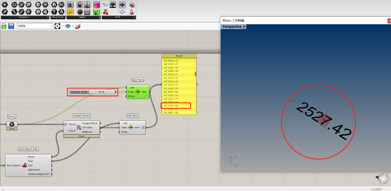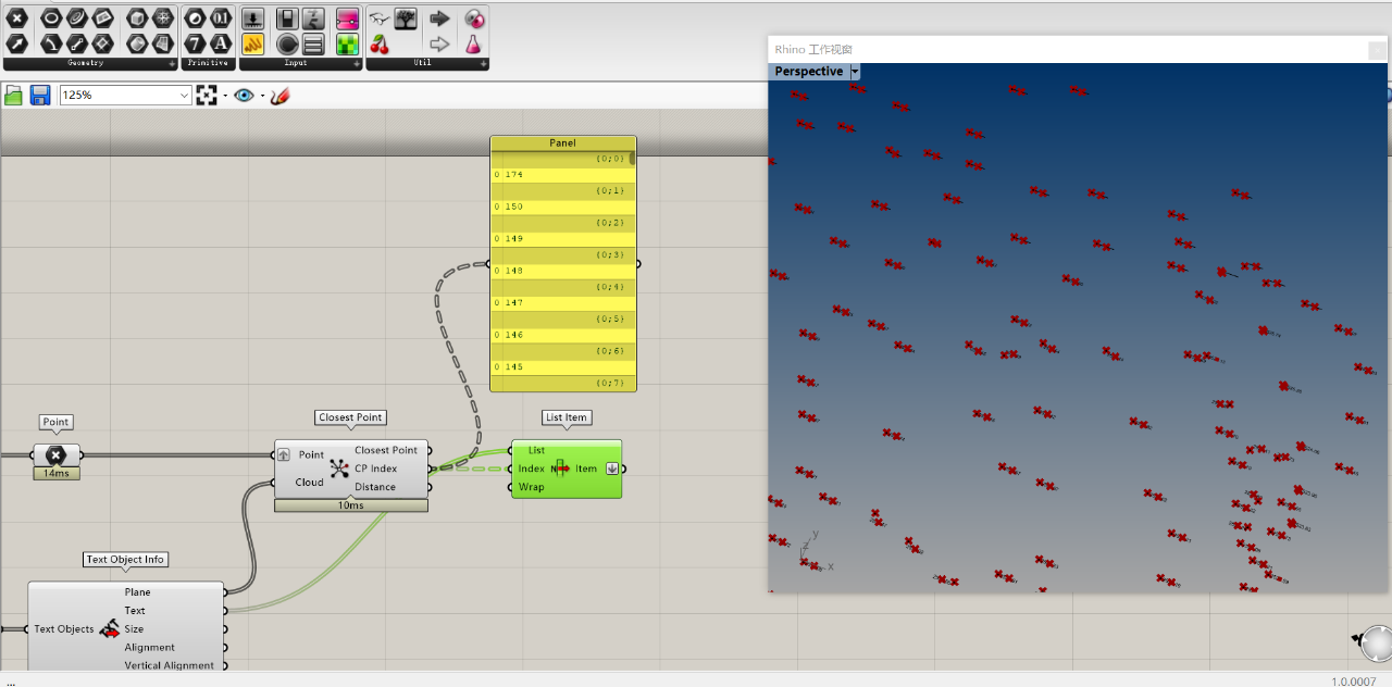 如果对结果不放心,可以进行检验,利用List Item对点进行随机抽取,然后鼠标中键点击List Item运算器Zoom缩放一下,可以看到对应的数据是否和我们再大袋子的数据是匹配的。