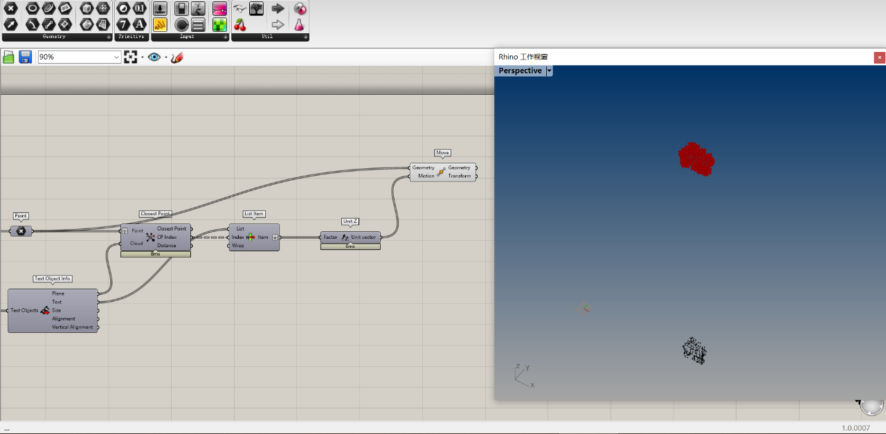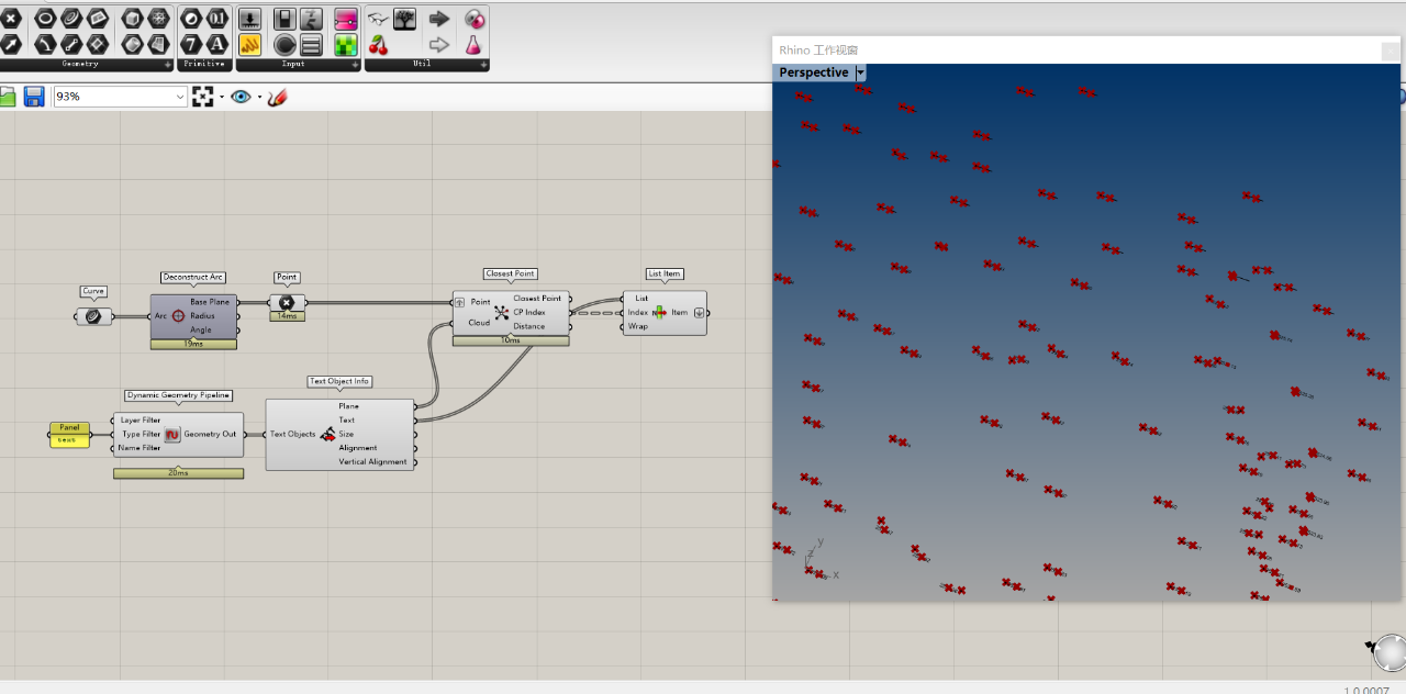 细心的朋友应该可以发现,在上一步拾取圆圈和text的时候并没有什么顺序可言,就是 “一把抓" ,这样盲目的去用点对应数据move是不能够匹配的。所以我们在此用closest point运算器去求得每个圆圈中心点附近离它自身最近的text。对于此运算器的理解对于小白来说可能得停顿半分钟,圆圈的中心点得Graft升组,让每个点都放到一个单独的袋子和下面text的平面点进行运算,这样就确保每个点都到下面的大袋子里找到一个合适自己的最近点。 如果上下两个数据列表都是大袋子,那就没办法确保每个点能和下边的大袋子每个数据都过一遍。