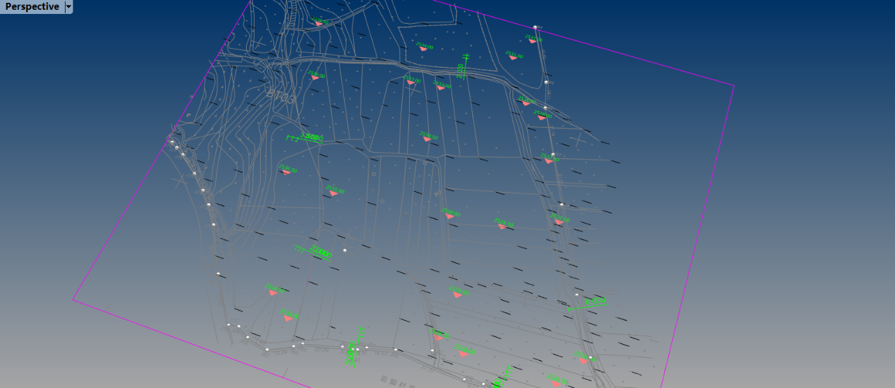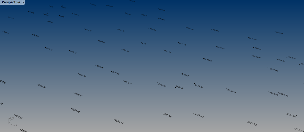 将CAD地形文件拖入Rhino中,(注:如果无法导入或者信息缺失,请转低版本CAD或者天正转T3进入Rhino)在此我们只需要高程点和高程数据(text),所以我们将其数字和点选取分别利用group命令成组,个人建议将这两组物件拷入另外一个Rhino文件,以免之后拾取text出现冲突。注意检查一个高程信息对应一个高程点,有些信息不完善的CAD图纸可能会出现信息不匹配或者有重复信息的问题。检测重复物件可以用犀牛命令:SelDup , 快速拾取文字和点分别可用:Selpt和Seltext,如果有分图层则可按图层选取:selLayer .