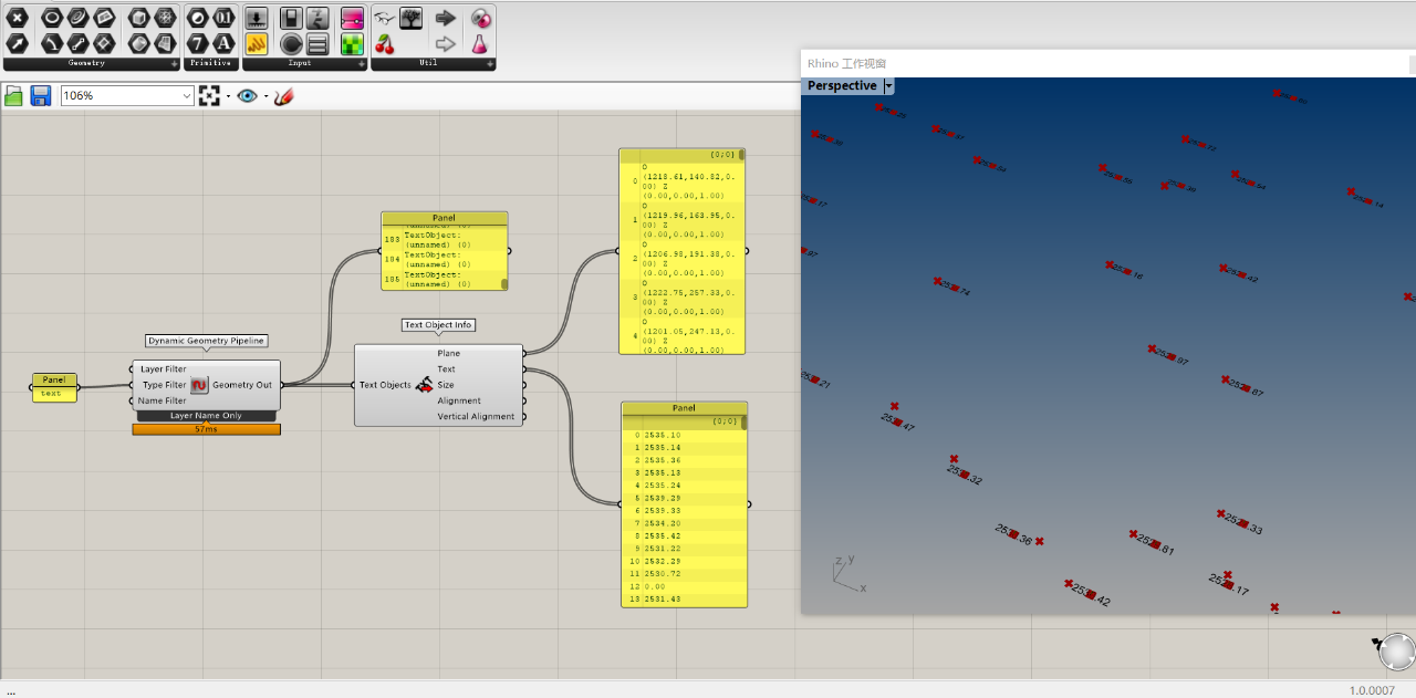 利用Human插件中的Dynamic Geometry Pipeline拾取犀牛中的text文件进入GH,这个电池可以根据图层名称,物件类型及物件名称拾取犀牛内的物件进入GH。我们这里利用拾取类别这一项。拾取进来之后发现输出的Geometry是没有任何数据的text,从而我们需要利用Text Object Info将其解析,该电池会输出text的平面,内容,大小等。