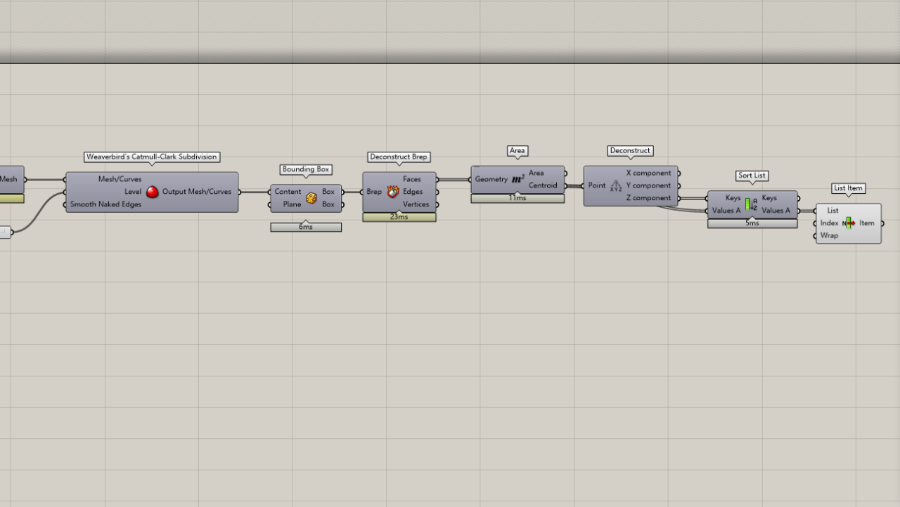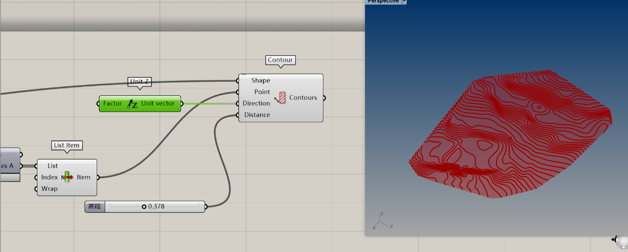 和犀牛内的Contour命令一样,要想Contour首先得有起始点。首先给上一步建立好的地形用Boundingbox 套上一层外接BOX,然后把BOX炸开求得每个面的中心点,再将中心点拆解成X,Y,Z坐标。通过Sort List 将Z坐标排序,Value端接入一开始的面积中心点,这样面积中心点就会跟着Z坐标的大小一样由小到大排序。所以List Item从ValueA抽取出来的第一个点就是最低点。