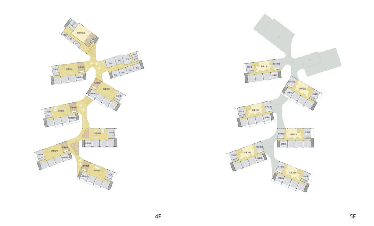 为此,我们在调研和参考了国内外近年来的优秀学校设计模式之后,提出了”没有长走廊的教学楼“概念,根据各个年级的平均分配,把原本分离的普通教室和实验、艺术、计算机教室混合编排,形成功能齐全的独立教学楼。学生的常规课程只需要在每个建筑内部就可以完成,从而释放出其他的校园空间形成有趣的公共和景观场所。