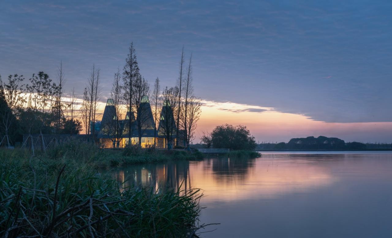 建筑对到访者提供体验风景的新视角。屋顶檐口被统一压低在2.7米。站在檐下向外观赏,平原湿地的广阔与静谧如同被收入画卷之中。空调出风口也被设置为地面出风,减少低檐口屋顶内饰中的视觉干扰因素。