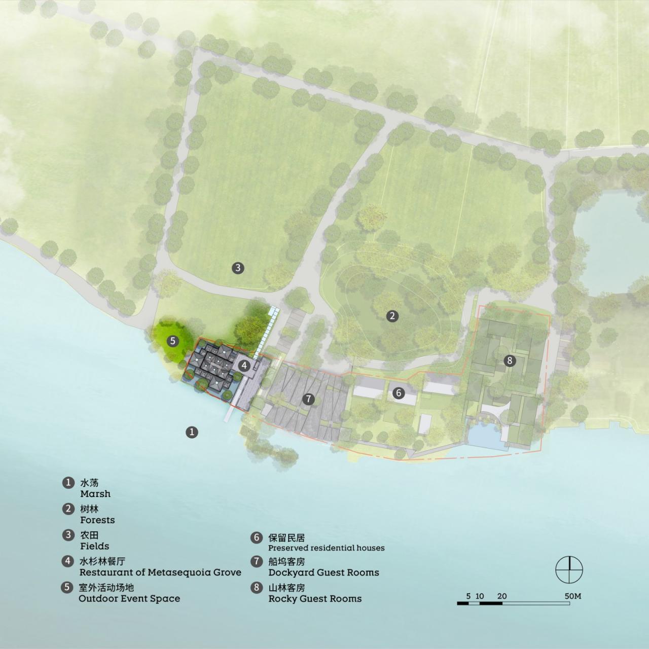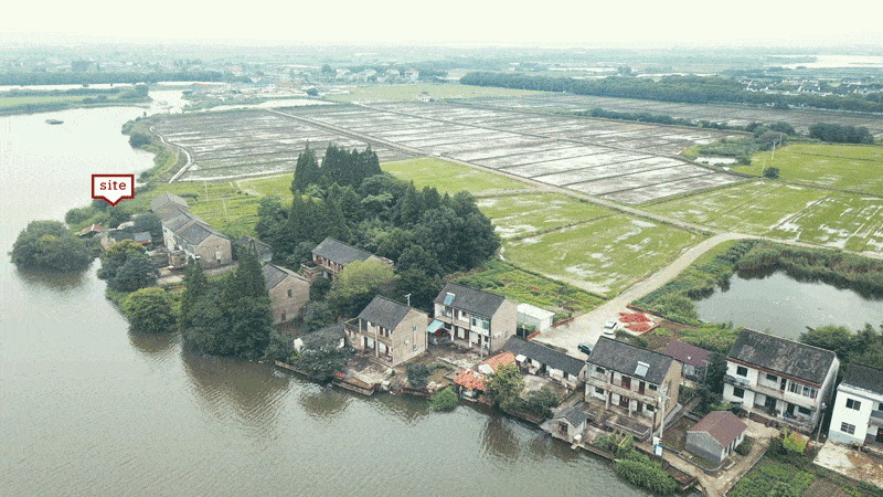 场地东侧是绵延的村落,西、北侧是农田树木,南侧是宽阔水体。紧邻的一小片水杉林是区域平原地形上唯一起伏的天际线,也吸引着人们的视线。