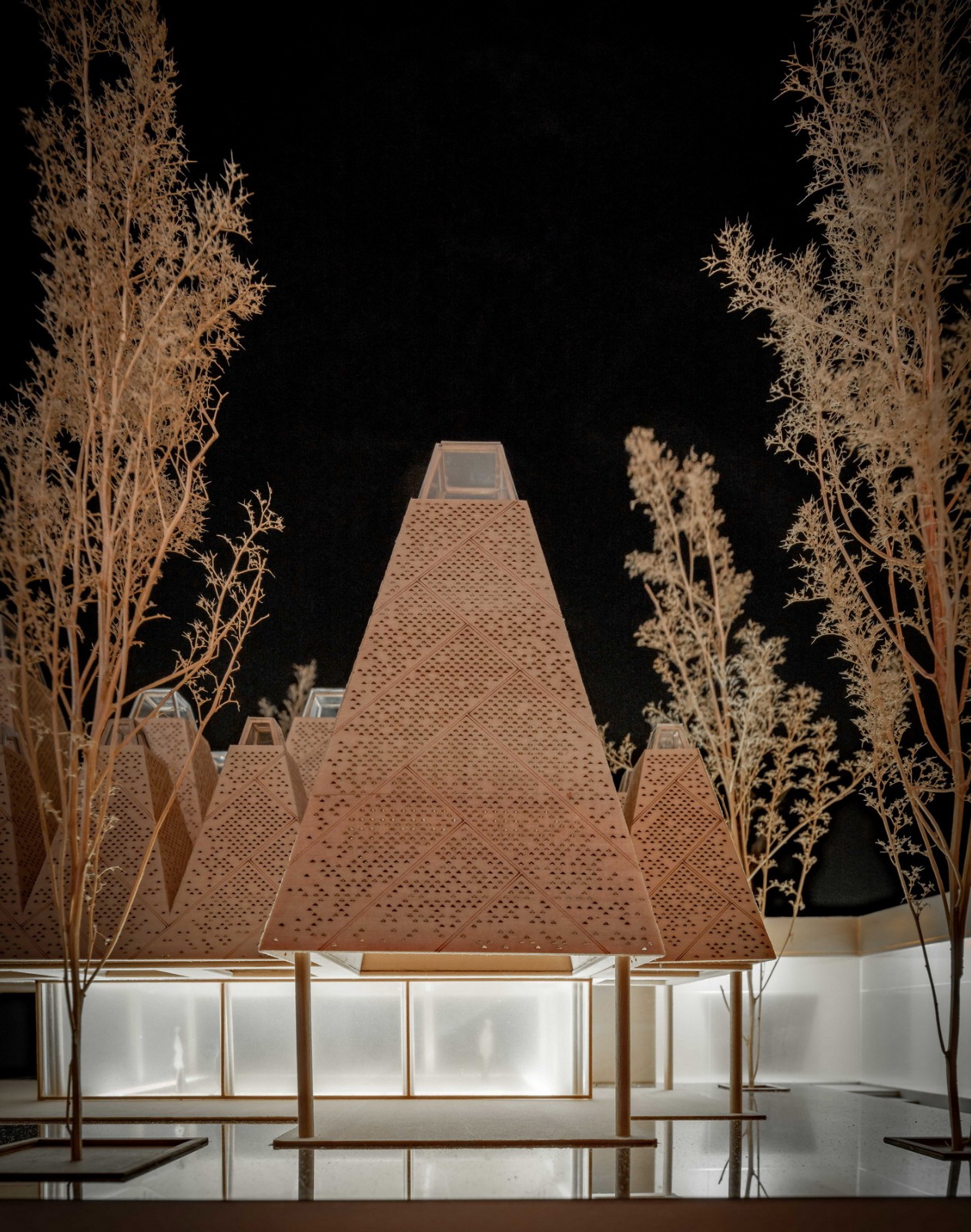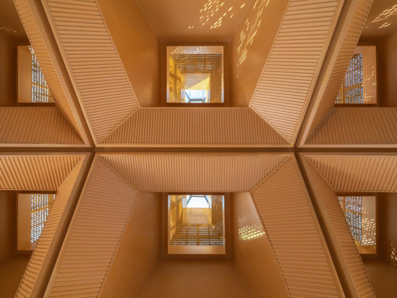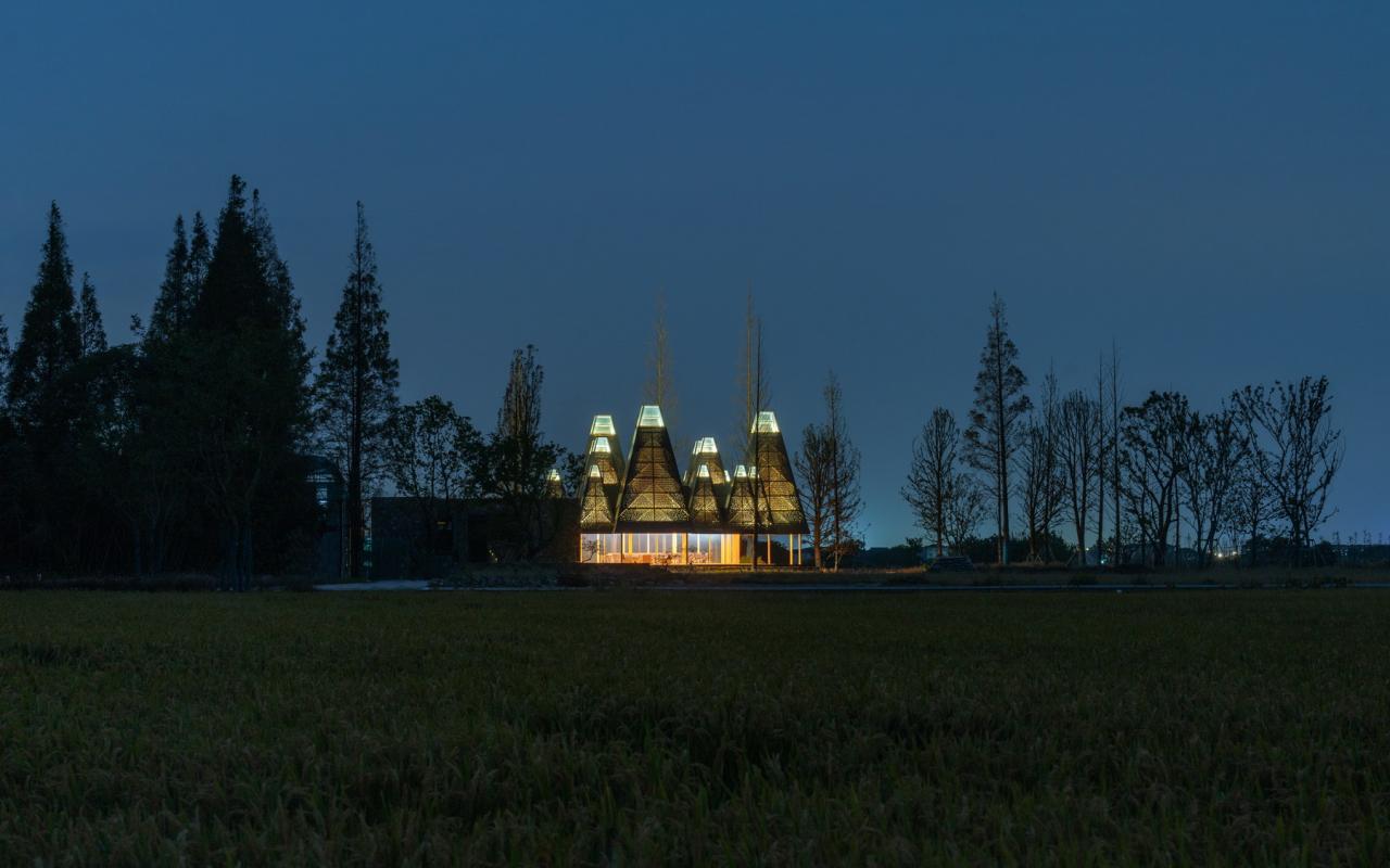 建筑师提取了水杉的意象,将其抽象转译为几何形态的建筑语言——方锥体,以此作为建筑形象的标识物。方锥体取三种尺寸,以底面方形边长2:3:4的数学关系构成小-中-大的模数秩序。最终,这些方锥体组合为一整片连续的屋顶,覆盖下部活动空间,如同自然界中的“众木成林”。屋顶整体控制在12米限高范围内。每个屋顶单元顶部为采光窗,能让自然光以较为温和的方式进入室内。屋面系统分为三层:外层采用定制的三角形孔洞穿孔铝板,呈现为水杉的枝干纹理;中层为玻璃;内层则使用木格栅。