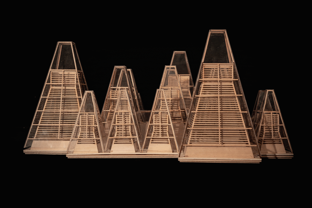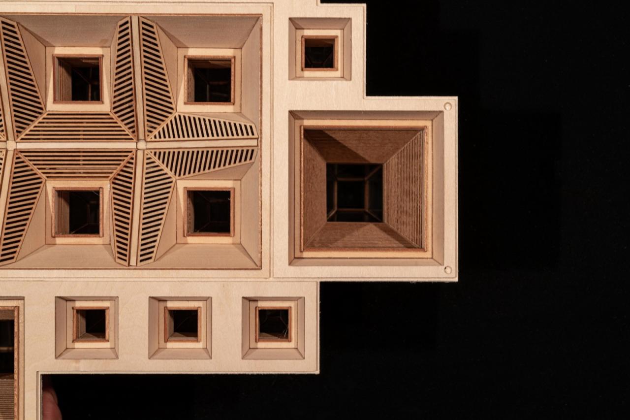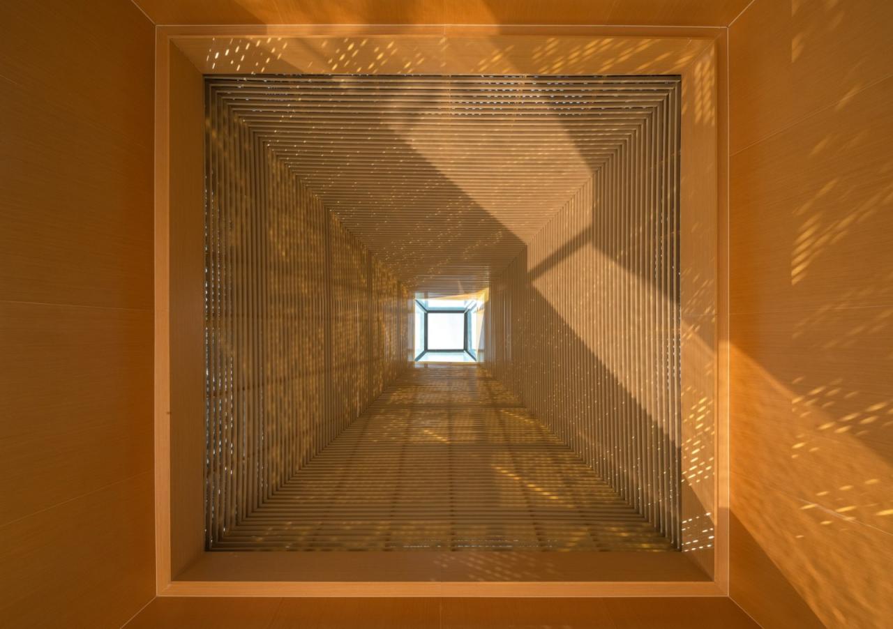 建筑师提取了水杉的意象,将其抽象转译为几何形态的建筑语言——方锥体,以此作为建筑形象的标识物。方锥体取三种尺寸,以底面方形边长2:3:4的数学关系构成小-中-大的模数秩序。最终,这些方锥体组合为一整片连续的屋顶,覆盖下部活动空间,如同自然界中的“众木成林”。屋顶整体控制在12米限高范围内。每个屋顶单元顶部为采光窗,能让自然光以较为温和的方式进入室内。屋面系统分为三层:外层采用定制的三角形孔洞穿孔铝板,呈现为水杉的枝干纹理;中层为玻璃;内层则使用木格栅。