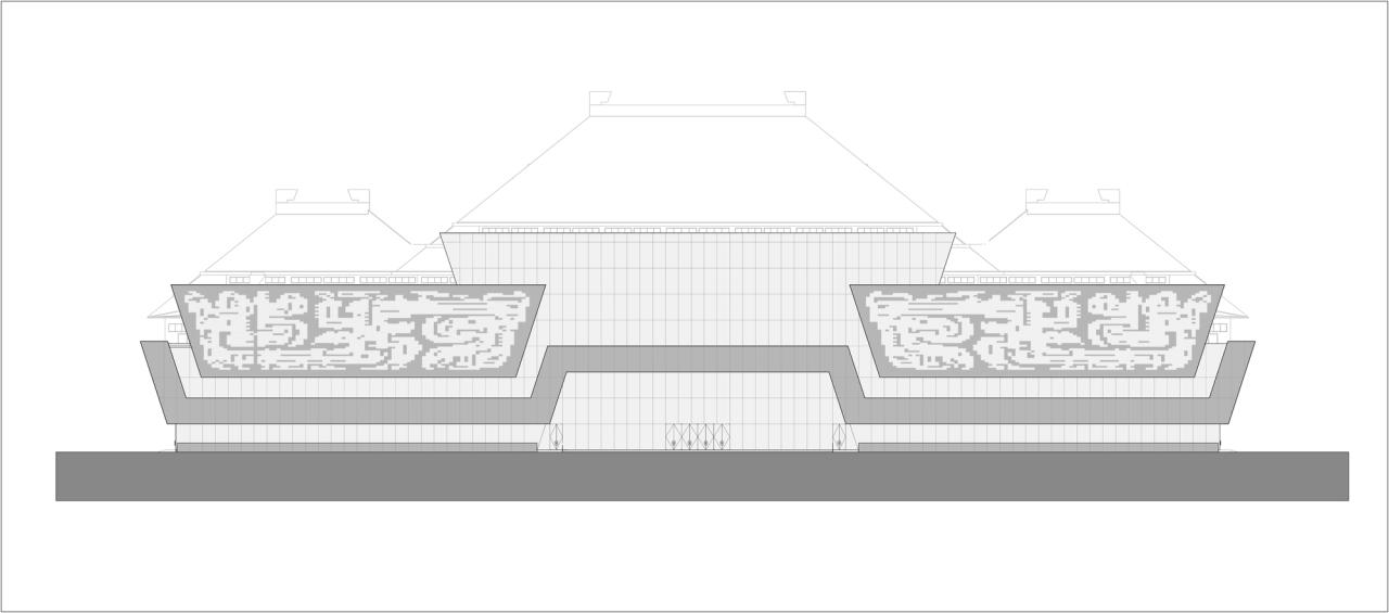作为扩建工程,如何处理新老馆之间的形体关系,是本次设计的突破点。设计灵感来源于博物馆藏品青铜器—簠。老馆屋顶呈现梯形的形态,新馆与之相对应采用倒梯形的几何形体,两者正好与簠的形态吻合。新老馆形体的组合在比例与尺度、界面与形态上都达到了高度的和谐,“合则一体,分则为两”,从功能使用角度也是对“簠”的完美诠释。