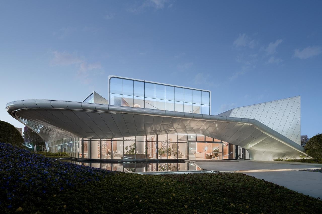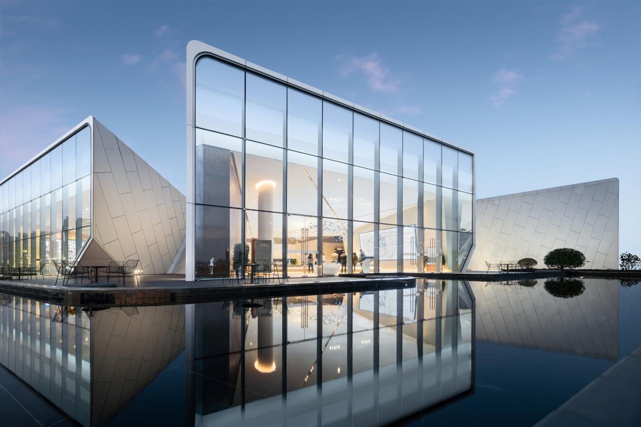建筑自远处眺望,仿佛浮于水上的科技方舟,色彩纯粹的金属外壳融入到水天一色的环境中,近看形体则如同波浪,水景水幕围绕包裹,整体营造水的故事,打造水上方舟的形象。