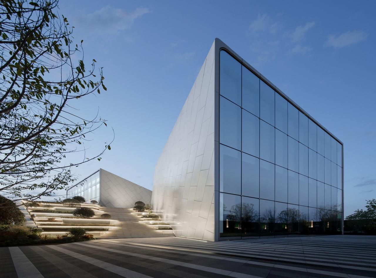 临于水畔的建筑物让人想到园林建筑中的“水榭”,铝板与玻璃幕墙构成的立面造型是现代化技术对于传统建筑观的精彩转译,既符合水榭建造所要求的轻快通透,通达舒展,与环境相融,与水景相宜,同时又是实际存在的分隔,满足建筑物的功能需求。