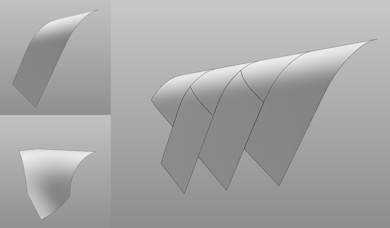 具有工艺感的倒角构成了二层的池水平台,铝板具有良好的韧性,设计调节二维曲线和三维曲面以达到好的效果,组成双曲面的铝板每一块都不同。