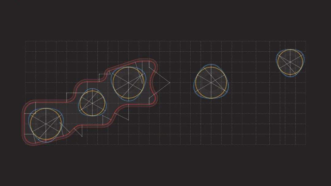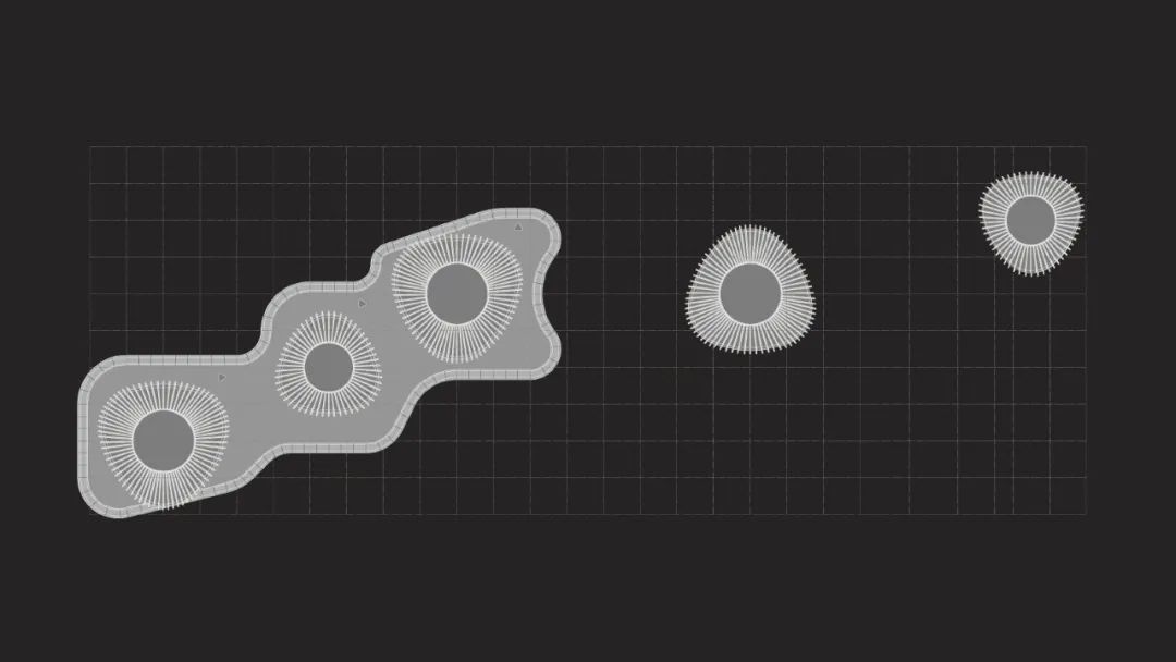 设计的难点在于协调地下车库的规整轴网与地上建筑的自由形态。UUA采取的方式是在地库轴网的基础上,用直线和相切圆弧的方式绘制出地上建筑的轮廓,形成看似随意,实则理性的几何控制。
