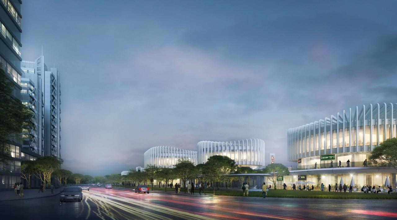 建筑的主体形象采用5座错落有致的‘兰花阁’,结合充满流动感的建筑裙房以及场地景观,形成了优美的俯视形态,为周边的高层建筑提供了一道靓丽的风景。