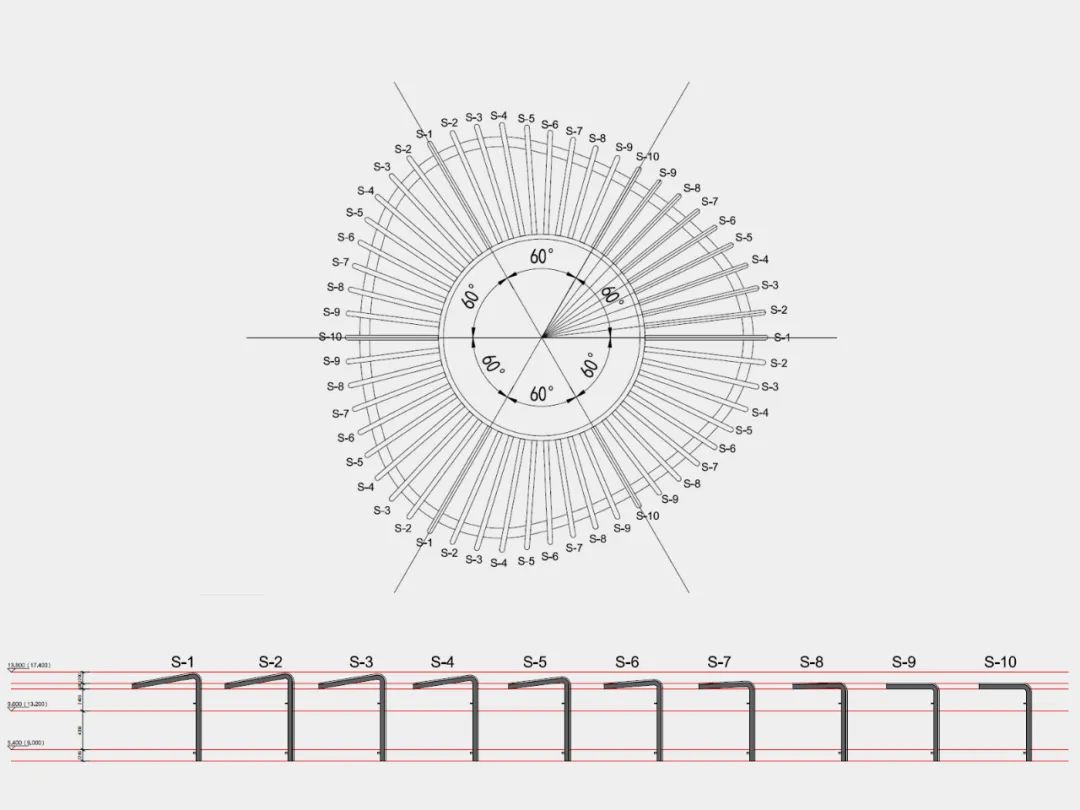 外格栅每60度为一组,每组包含S-1至S-10十种外格栅型号,通过反复镜像,实现‘兰花阁’的起伏形态