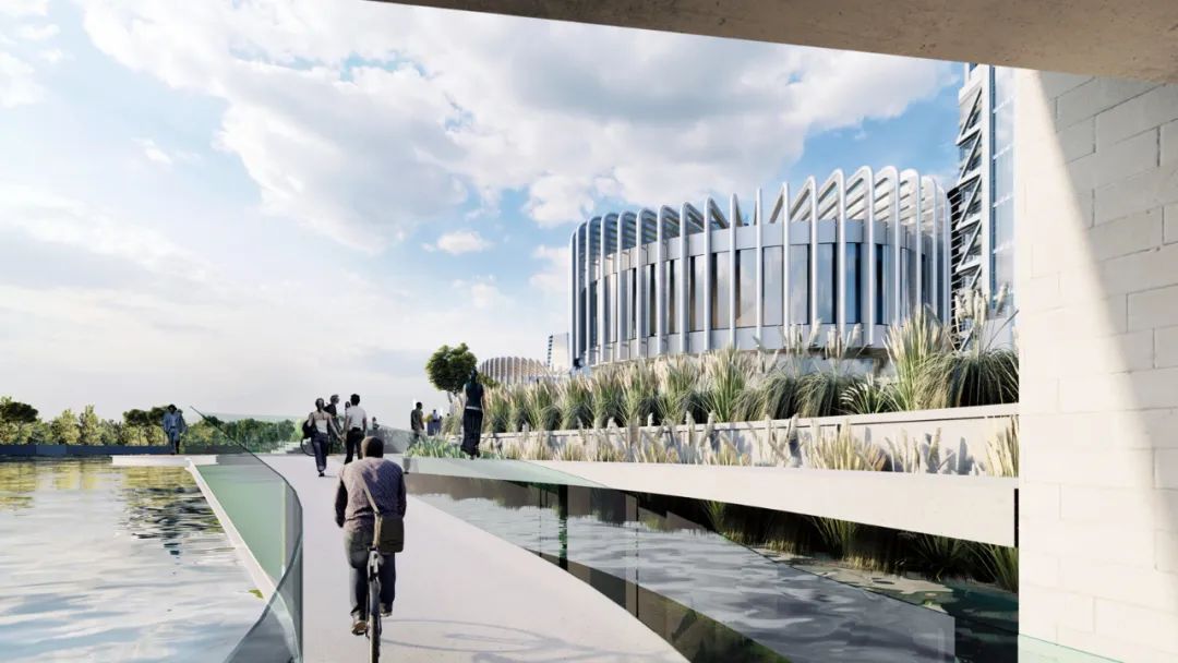 依据片区的大规划,本案沿河设置了3米宽的滨河慢行道。慢行道全程无台阶,满足散步、慢跑和骑行的需求。慢行道在南、北两端通过桥下栈道连接到临近地块,形成连续的运动空间。滨河慢行道重新定义了本案的公共空间,倡导了一种健康的生活方式,建成后将会吸引更多人来河边休闲健身。