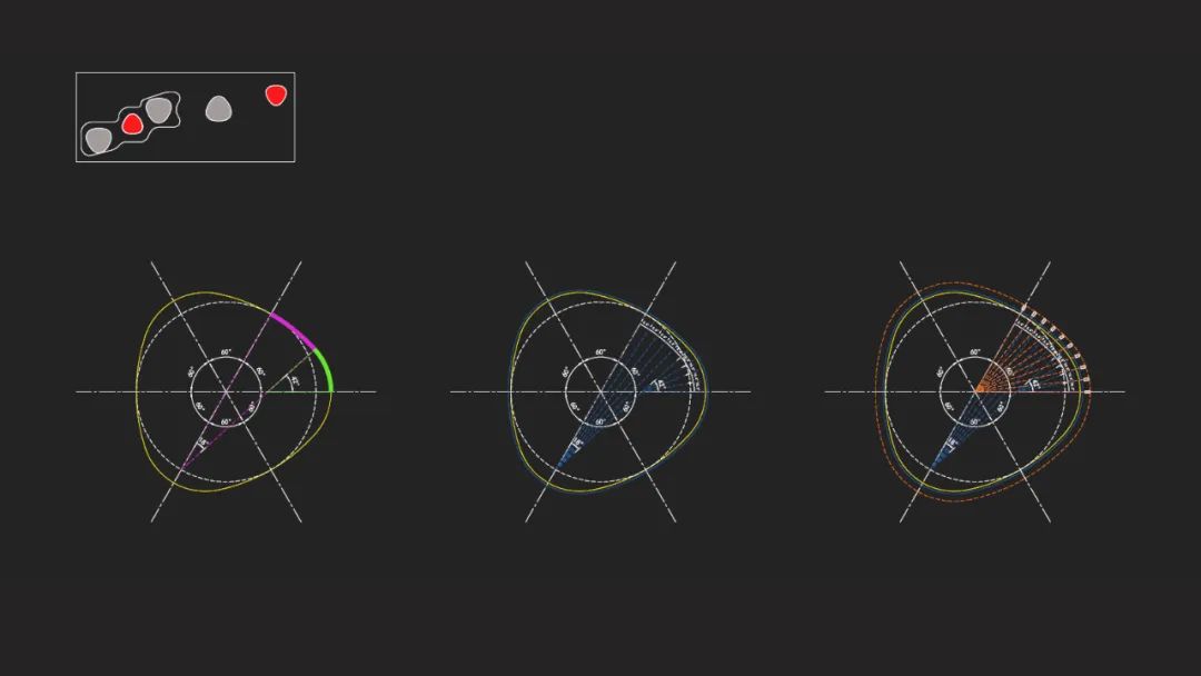 五座‘兰花阁’分为3大2小的两种尺寸型号,亦是通过严格的几何控制得出楼板控制线、玻璃幕墙控制线、和外格栅控制线。