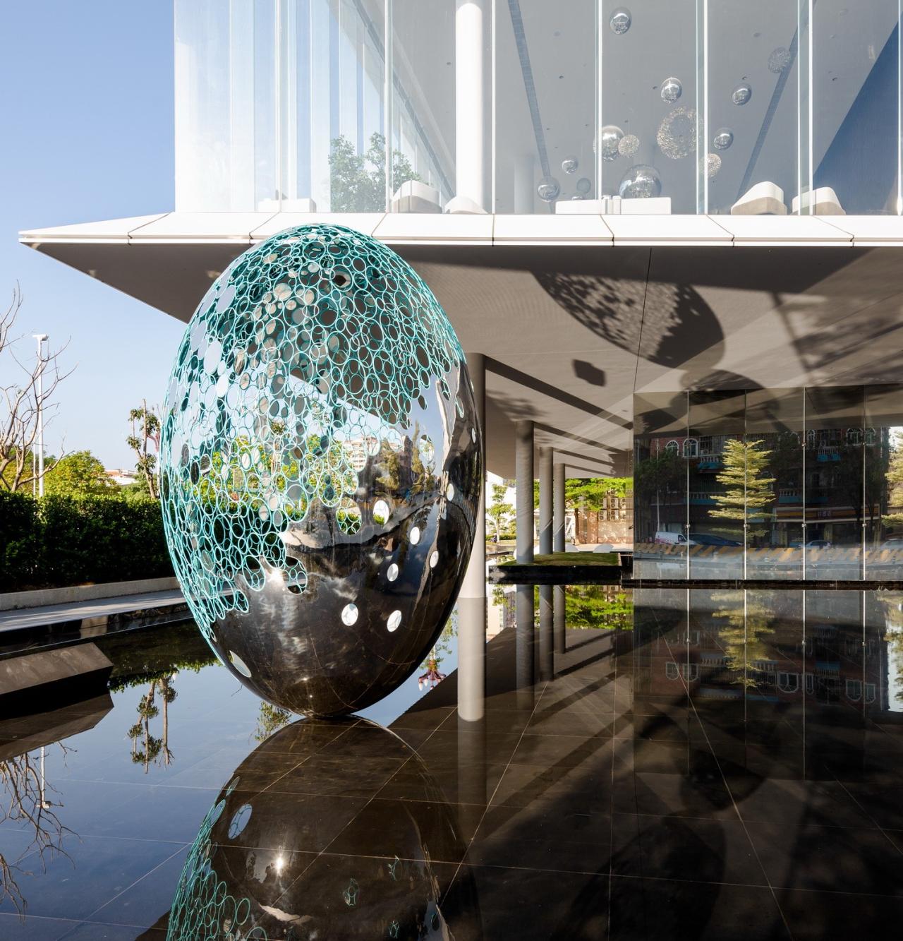 建筑底部灵动的曲面雕塑打破了直线感一贯的单一与宁静,它通透生动,镜面的反射出周围的环境与它的关系。