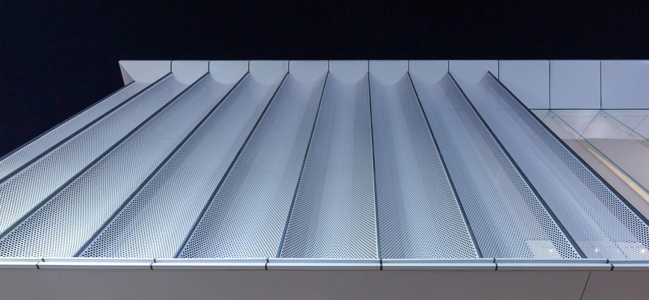 外包结构上采用大面积穿孔板和大面积玻璃幕墙相结合的方式,强调现代感及通透感,并提升项目整体品质。
