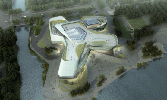 宁波市城市展览馆项目位于宁波市江东区。工程地下1层,地上4层,总建筑面积23622㎡,建筑高度24m,鸟瞰形体似一个巨型风车,由中庭及四块大翼片组成,外立面由双层幕墙组成,幕墙总面积为18500㎡。主要幕墙系统内层为异形多面角明框框架式玻璃幕墙和铝板幕墙,外层为环绕着玻璃幕墙外侧扭曲的异形截面釉面干挂陶土板幕墙,陶板面板为三维空间疏密无规律变化叠加排布,沿玻璃外立面环绕上升至屋顶采光顶四周围合,中庭采光顶为钢桁架结构,夹层中空玻璃面板,下部悬挂PTFE遮阳膜。幕墙整体立面效果图如图1所示。