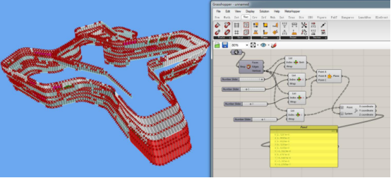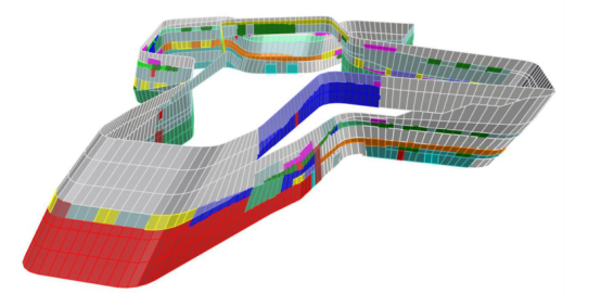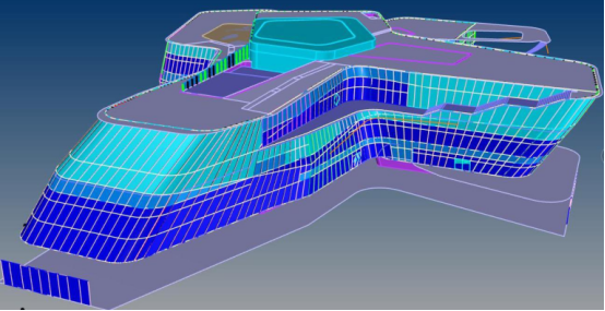 进一步对幕墙表皮进行合理优化,通过对曲面分析确定翘曲值,将拱高及翘曲值9mm以内的面板进行合理优化,以平板玻璃代替单曲玻璃,单曲玻璃代替双曲玻璃,并分析优化后的板块造型是否既能满足建筑师对效果的要求以及面板材料的加工、安装需要,从而降低了施工难度及节省造价,并通过对面板面积的分析为设计明确板块厚度及构造提供依据,如图8、图9所示。施工图设计阶段需对模型精度进一步提高,辅助幕墙设计来完成设计工作任务,与幕墙设计协同工作。