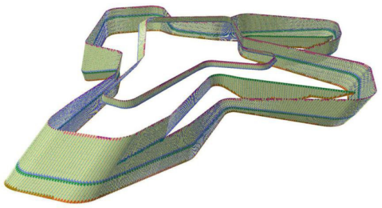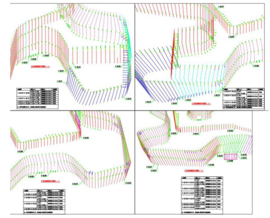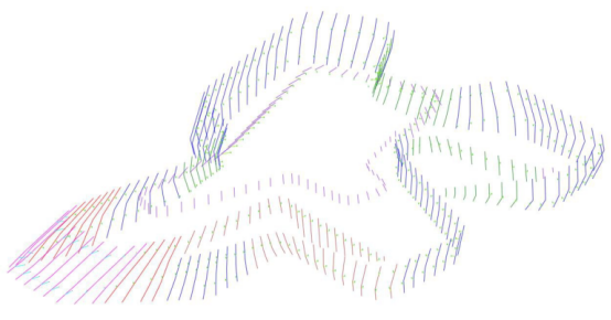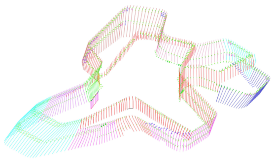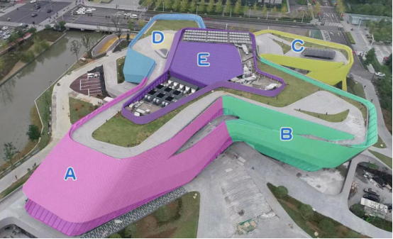幕墙工程根据翼片位置分为A区、B区、C区、D区及屋面E区5个区块。其中玻璃种类有16种,共1679块,每个板块具有唯一性;异形陶板规格7459种,27883块。本工程为双层幕墙,外层陶板幕墙与内层玻璃幕墙间距最大为3.3米,最小为1.1米,幕墙剖面为异形转折面,故大多数立柱骨架由两根或三根矩形钢管上、下扭转拼接而成,且安装定位均为空间定位,玻璃幕墙立柱骨架为475根,陶板幕墙立柱骨架为269根,每根骨架均具有唯一性,对加工及施工都存在极大的难度。部分陶板幕墙骨架位置除与主体钢环梁连接外,还需与玻璃幕墙立柱之间通过牛腿进行连接,且空间牛腿定位复杂。幕墙分区如图2,陶板幕墙及玻璃幕墙立柱三维线模图如图3、图4所示(注:不同颜色线型代表骨架不同规格),部分双层幕墙主要进出剖面图如图5所示。