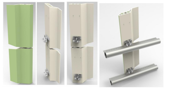 另利用BIM模型直接可测出板块与板块间夹角、板块与水平面夹角及板块面积等信息,设计师根据实测数据对玻璃幕墙构造进行合理设计,并确定板块种类;陶板幕墙对建筑设计方案板块排布进行分析,陶板的排布利用BIM软件进行参数化设计,板块不仅是错缝叠加分布,板块左右、上下间距均为可变数,且板块在空间三维坐标里任意转换角度,因陶板幕墙为装饰幕墙,内侧均为可视面,幕墙设计必须利用三维空间参数来设计合理构造,并应保证陶板幕墙连接构造的美观及安装简便,且设计完成后必须通过BIM三维模型来进行验证模拟,是否满足所有角度及各异形部位安装要求,尤其针对角度变化大、双曲面及转角折角等特殊部位的连接,通过验证及时发现系统构造所存在的实际问题并找出缘由,提出可行性解决方案,主要幕墙连接构造只有通过了系统性地验证及研究,才能确保后续项目的施工作业的顺利进行。系统验证模型如图10、图11所示。对幕墙系统的验证初步凸显了BIM应用的优势,避免了幕墙设计系统出现错误或无法实现的情况,保证了设计质量。