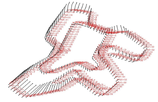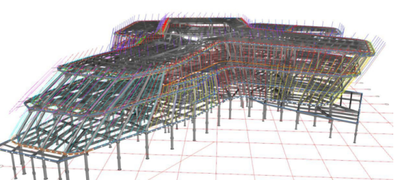 施工前期整合幕墙与主体钢结构BIM模型,根据模型中板块分割尺寸确定骨架与主体钢结构间的空间位置关系从而确定埋件定位,考虑主体钢结构加工过程中便对幕墙埋件钢板进行焊接,故需由建筑幕墙施工单位提供埋件点位给主体钢结构加工厂,并在钢结构安装完成后对现场实际埋板位置进行复核,将复测值反馈至三维BIM模型中进行比对,然后修正模型,便于其他构件定位点准确信息的提取,提供现场施工人员进行骨架测量放样定位。埋件定位模型如图14所示。基于异形建筑幕墙空间扭曲的特点,各个构件的定位点均无规律可行,且承载数据信息过多,只有通过BIM模型辅助才能实现测量放样。