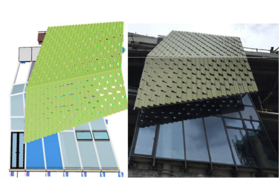 首先在项目现场进行1:1实体施工演练和构造验证样板施工,对BIM技术应用、参数精度及施工工艺进行验证,样板包含了电动开启窗、消防救援口、室外门等代表性构造,样板完全按照BIM模型提取的加工参数和定位数据安装,通过样板的正式实施,发现并解决后续工作中可能出现的问题,起到了非常好的效果。通过对实体样板的检测,验证了BIM技术在本项目的可行性。BIM模型与现场实施样板对比如图19所示。