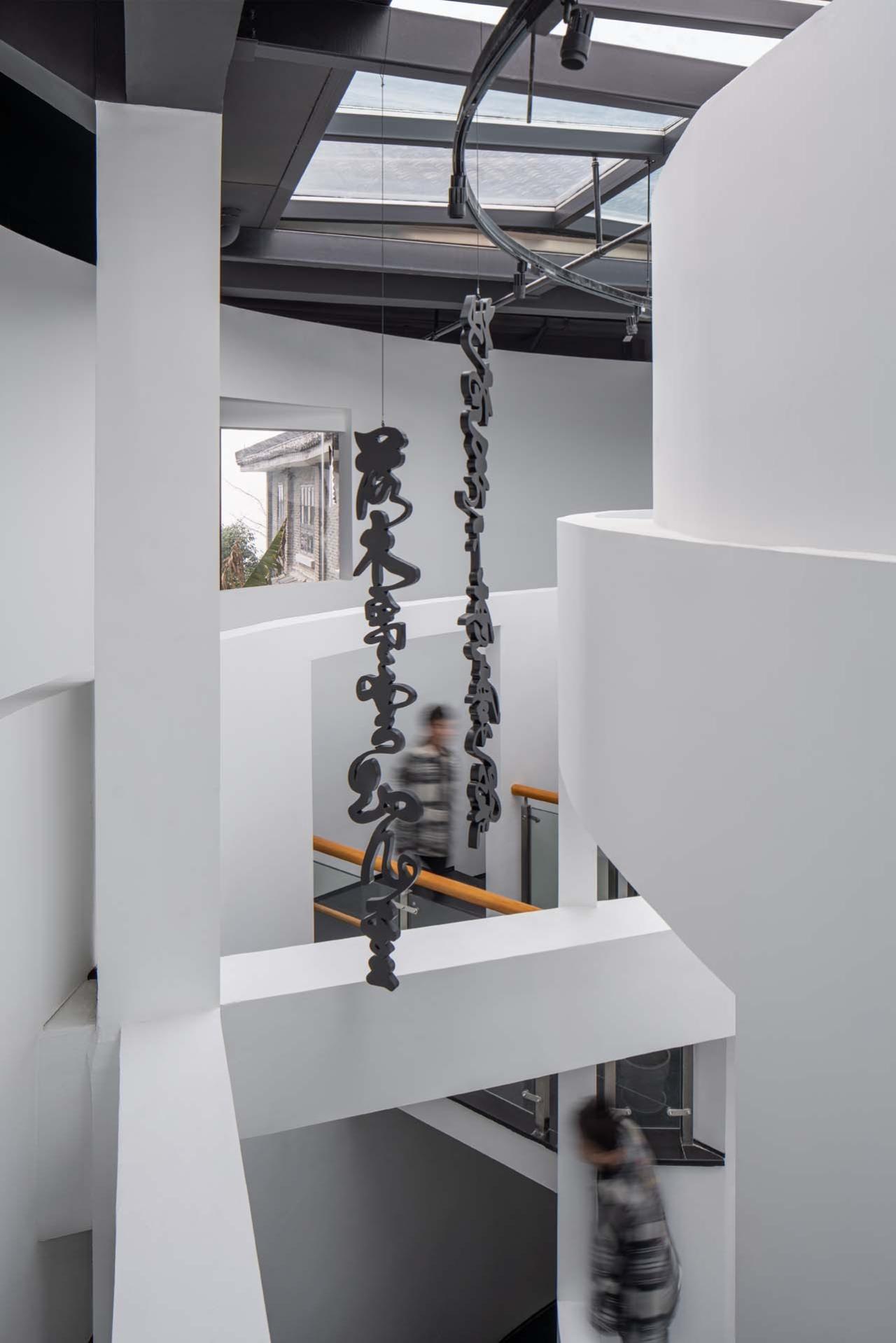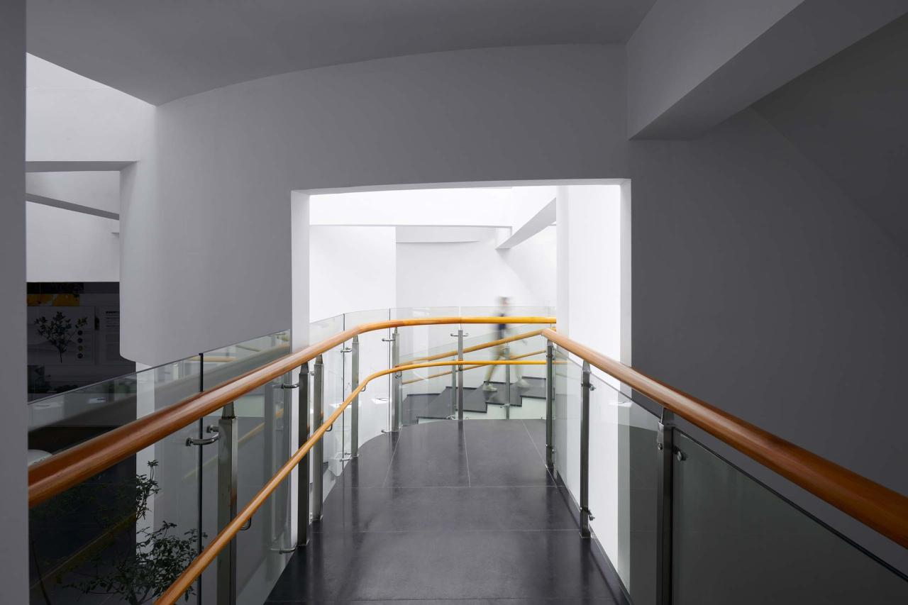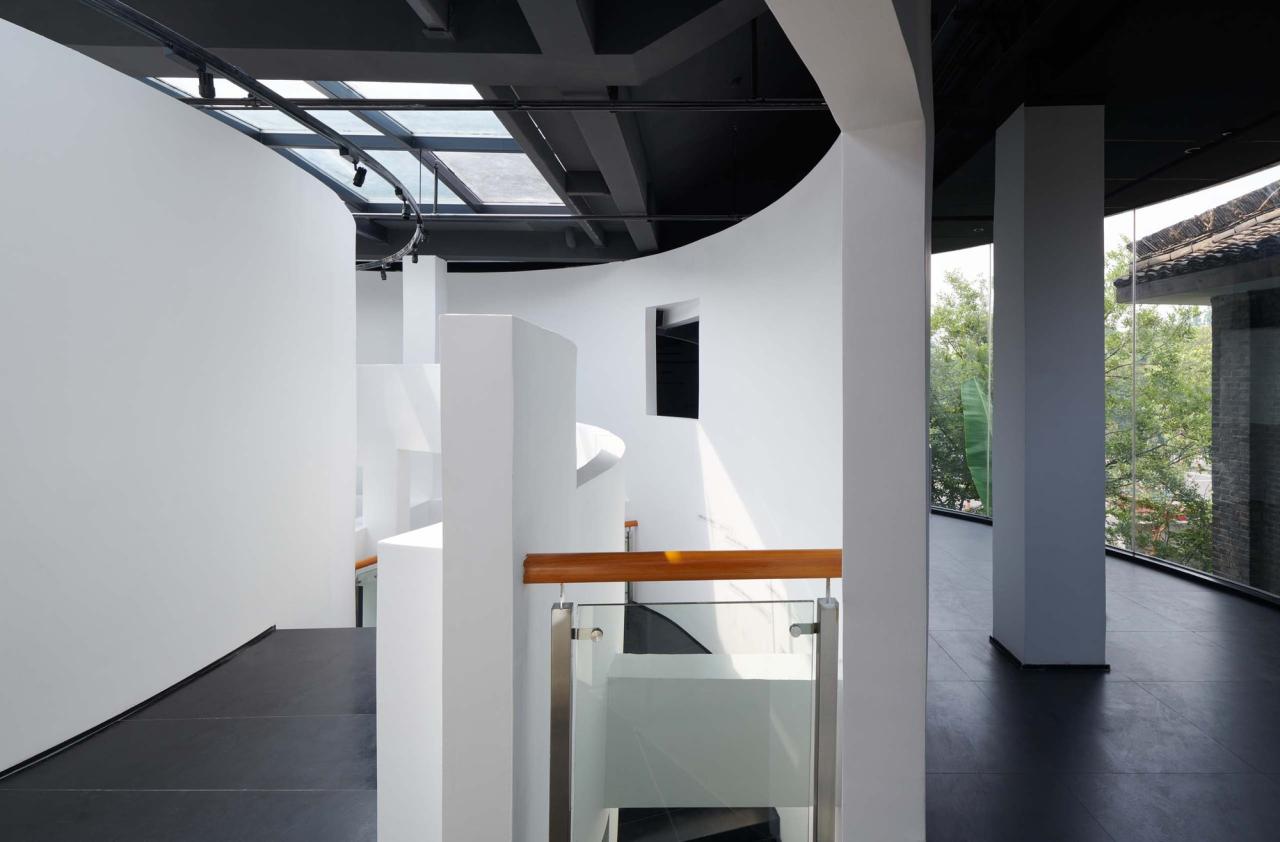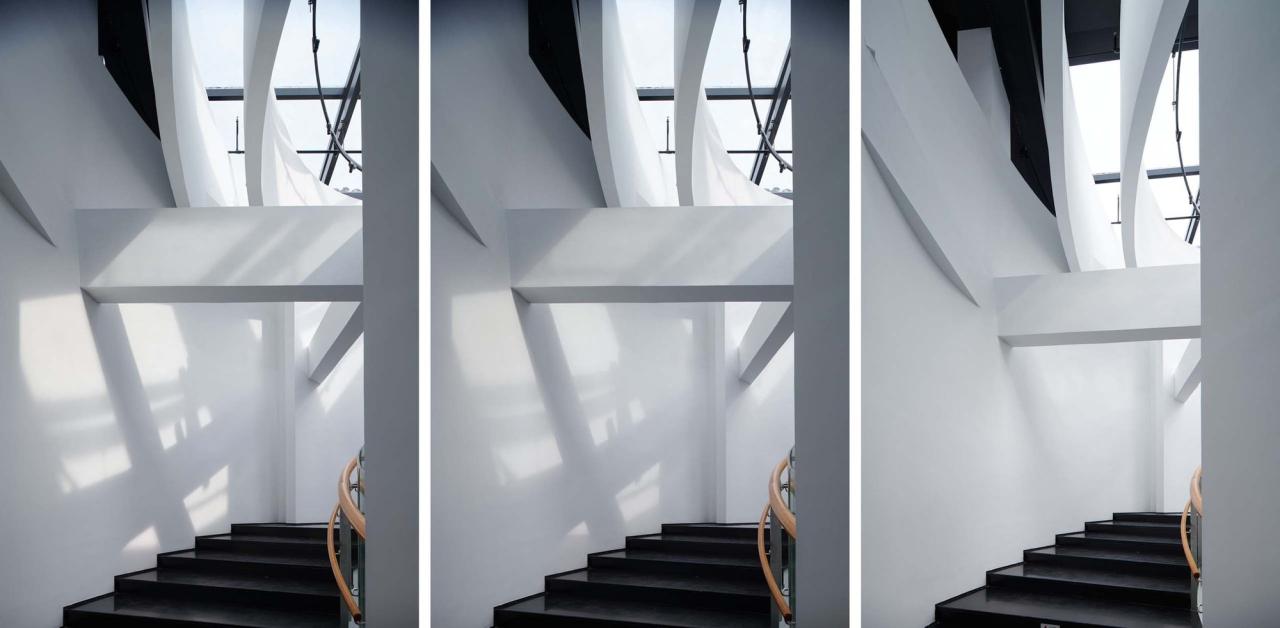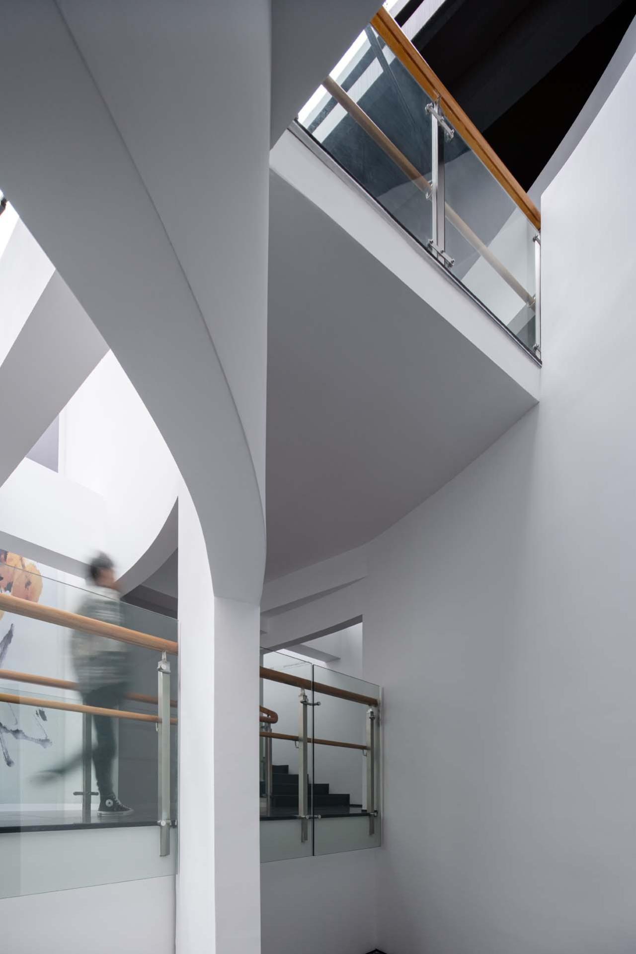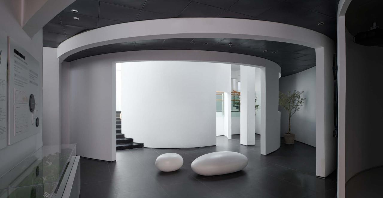 多样的理解方式大致可以分为三个层面:第一层是“顺势”。“顺势”是环形中庭最基础的读解关系,它是顺延着弧形的壁面缓缓前行的过程。“重环”之所以称之为“重”是一种错位关系的体现,“重”并非在原地无意义的重复,而是一种“复影”系统,“重”的错位与偏转带来了一系列的空间缝隙,这些缝隙打破了两层空间的界限,建立起了多个维度的联系,让气息可以流通。“重”是一种人为创造的“美妙的误差”,它赋予了形态背后更多的可能性,也是赋予椭圆这种简单的几何形体以生命的过程。由于“重环”自身的错位系统,使得参观者的行进路线与环形并非完全贴合,有些环形会离开我们的路径渐渐远去,而有一些则从远处向我们慢慢靠近,这使得简单的环绕过程变得更具有诗意。参观者亦可以透过这些缝隙,与即将到来或是已然走过的空间对望,瞥见未来与过去的片段。一些片段的消失则预示了其从另外一个维度的再现,这种“复现”的片段与之前的消失的部分在空间的维度上又建立起了对位关系。因而在参观的过程中,“重环”复合了一系列推进与远离的过程,又通过消失与再现建立起了一种记忆上的回溯, 便形成了一种独特的,熟悉而陌生的空间感受。